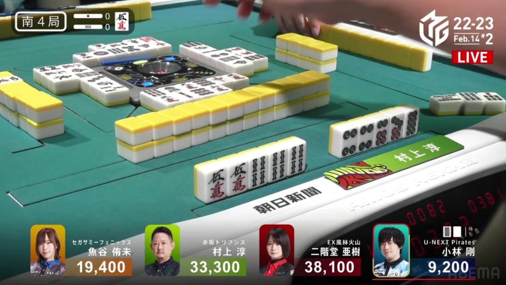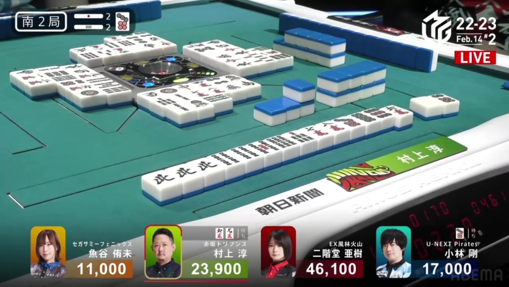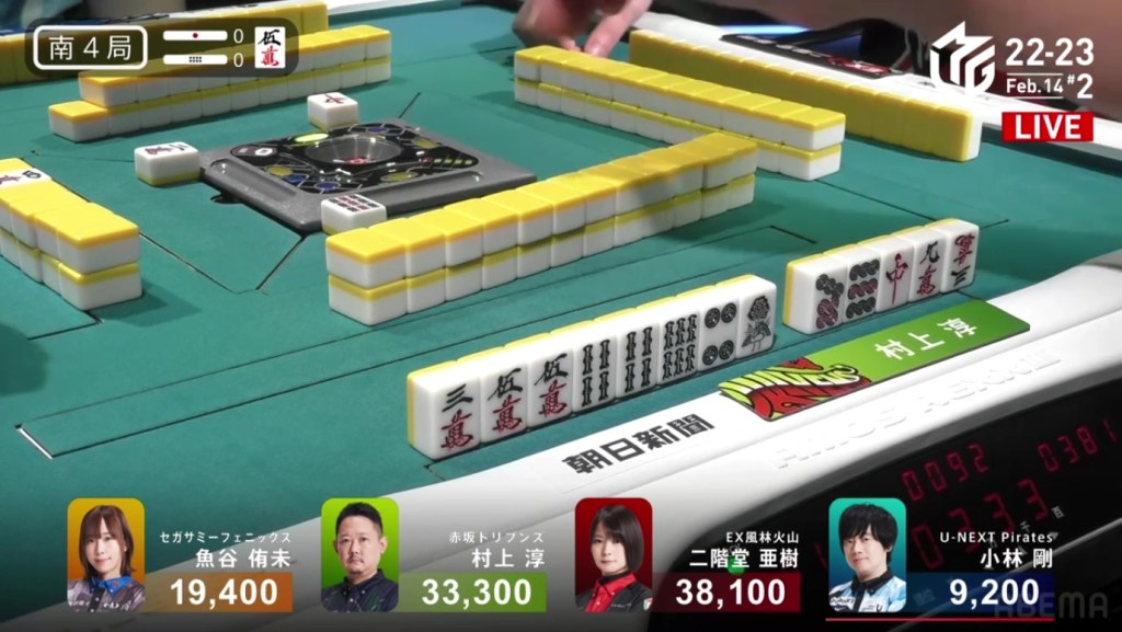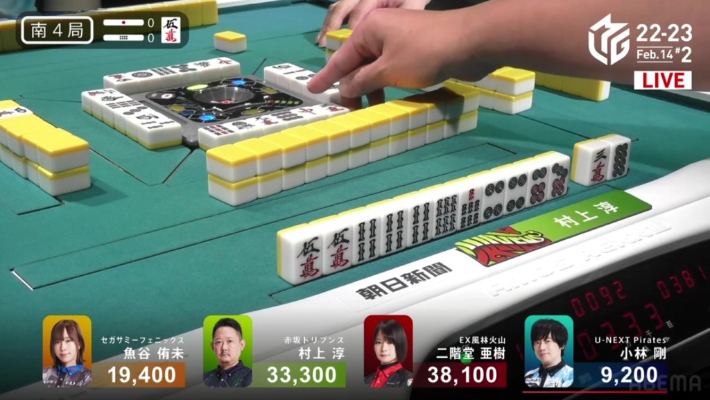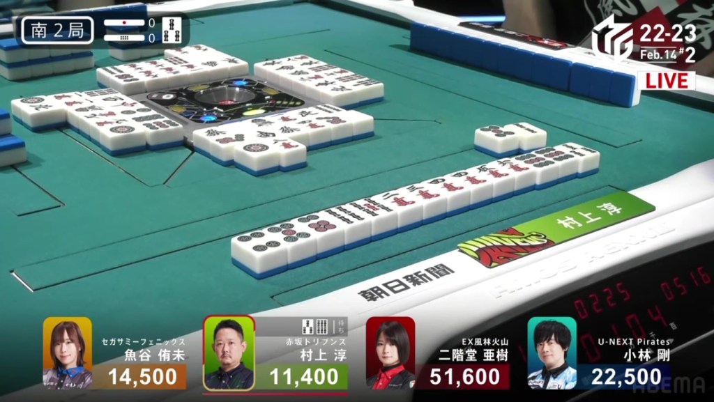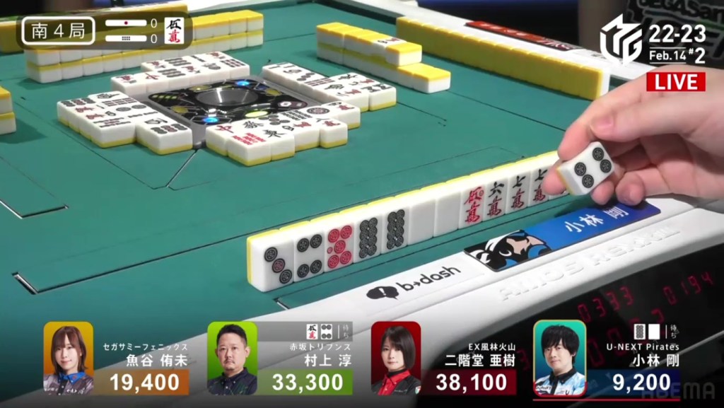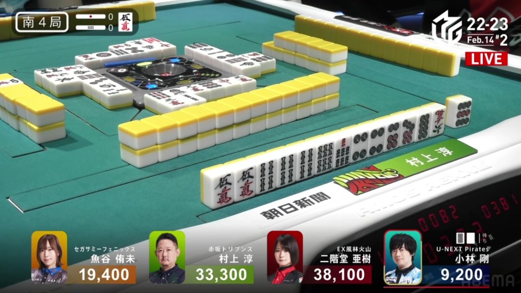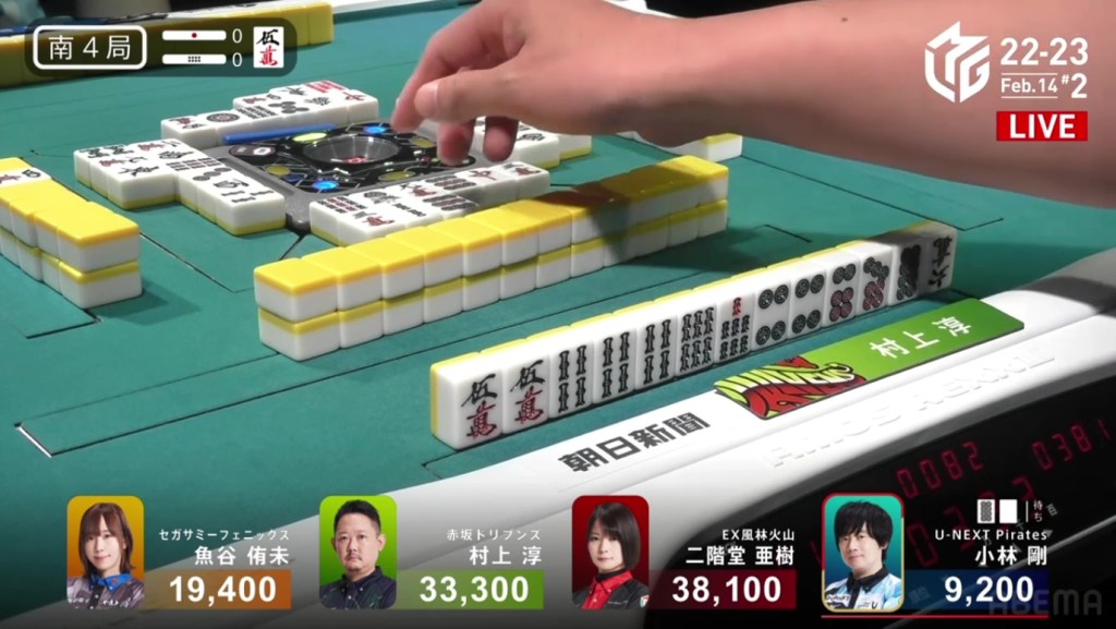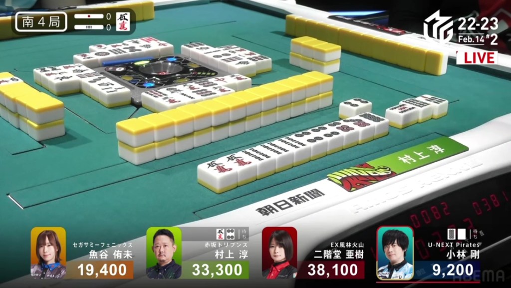 In S2-0, Murakami is the dealer in 4th place, 3,100 behind 3rd place Uotani and 11,100 behind 2nd place Kobayashi. He is currently without a 1st place this season and his team is last in the standings. There is no better time than now to have an incredible comeback.