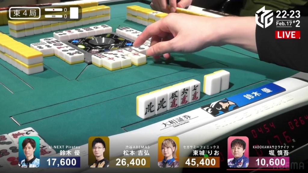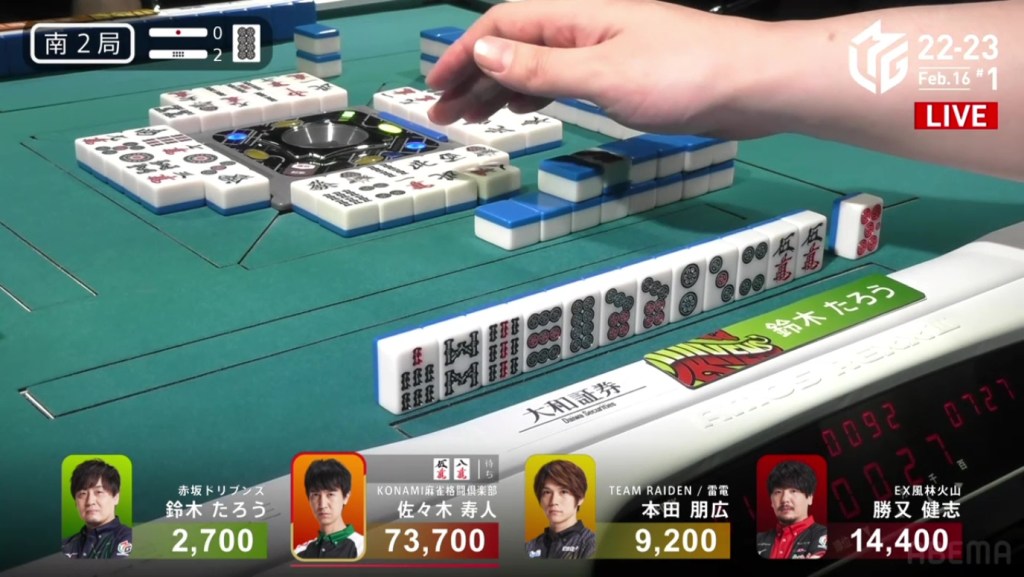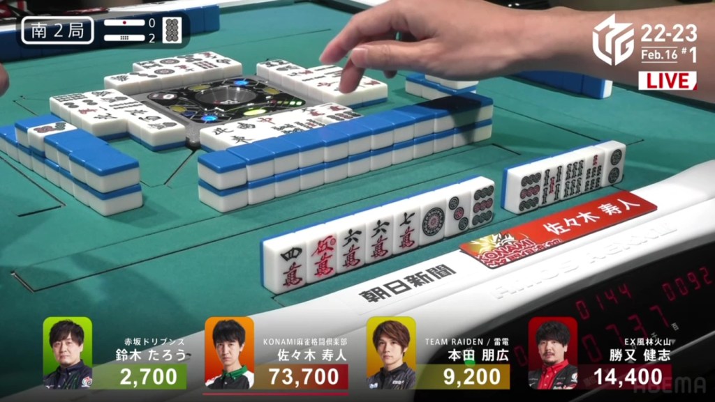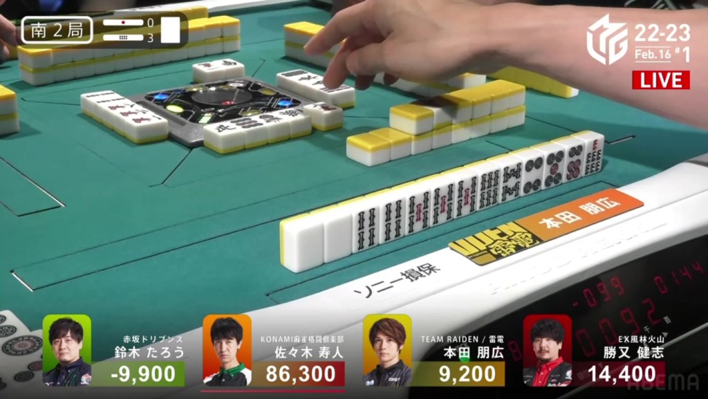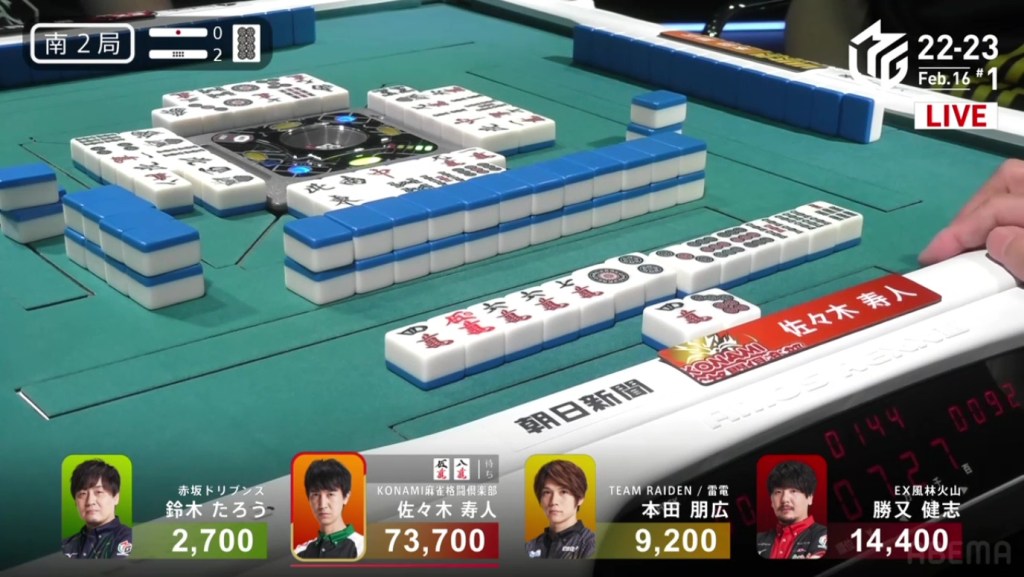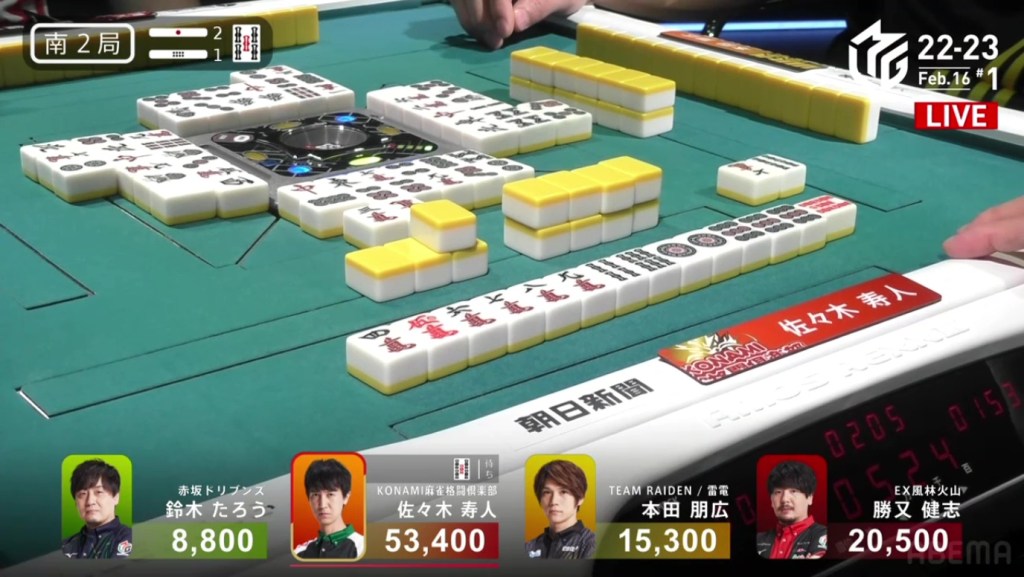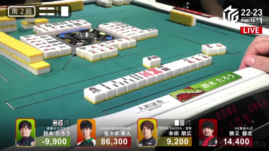 After going to a draw the next hand, Murakami’s search for his first 1st continued in S2-2. He is still 22,200 behind 1st place Aki, but there are 2,600 in bonus sticks available and he can go as high as he wants during his dealership.
