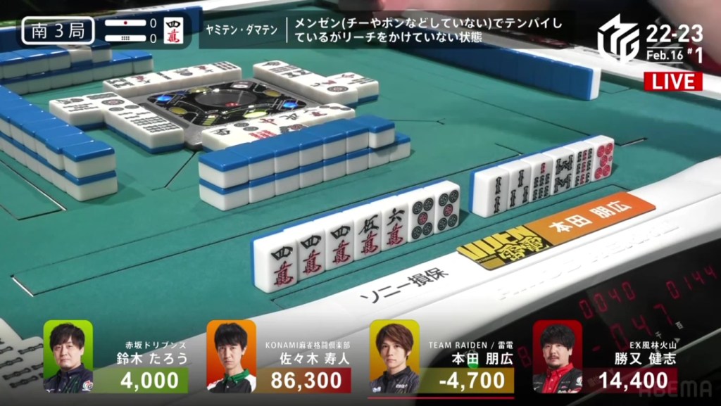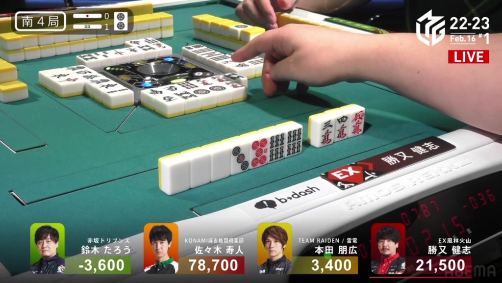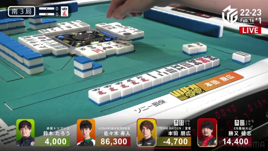 In S4-1, Taro is in 4th place after Honda had the surprise dealer haneman. With Taro 7,000 behind 3rd place Honda, he needs a 3/30 direct hit, a 4/25 or 3/50 tsumo, or a mangan general ron to move up.