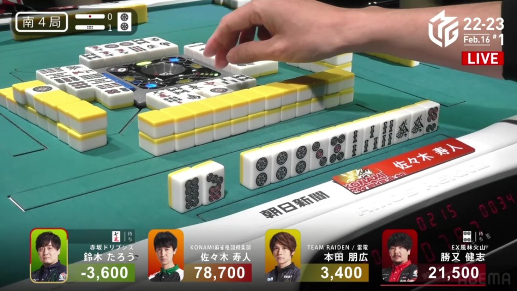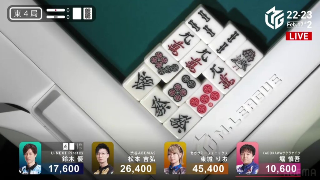 Counting tiles, Kobayashi has one of each of Murakami’s waits and Uotani has the other 5m. Murakami has one tile, one chance to finish it. Just the one 4p. On Kobayashi’s next draw, he gets the 4p.
