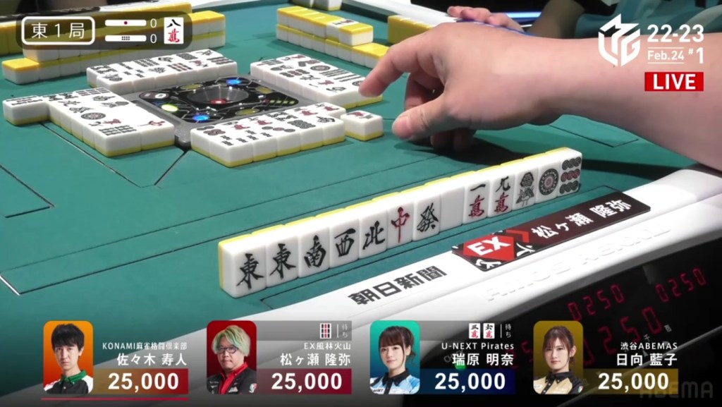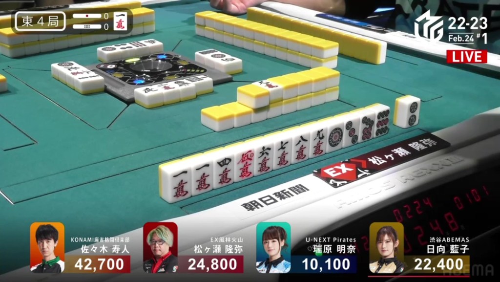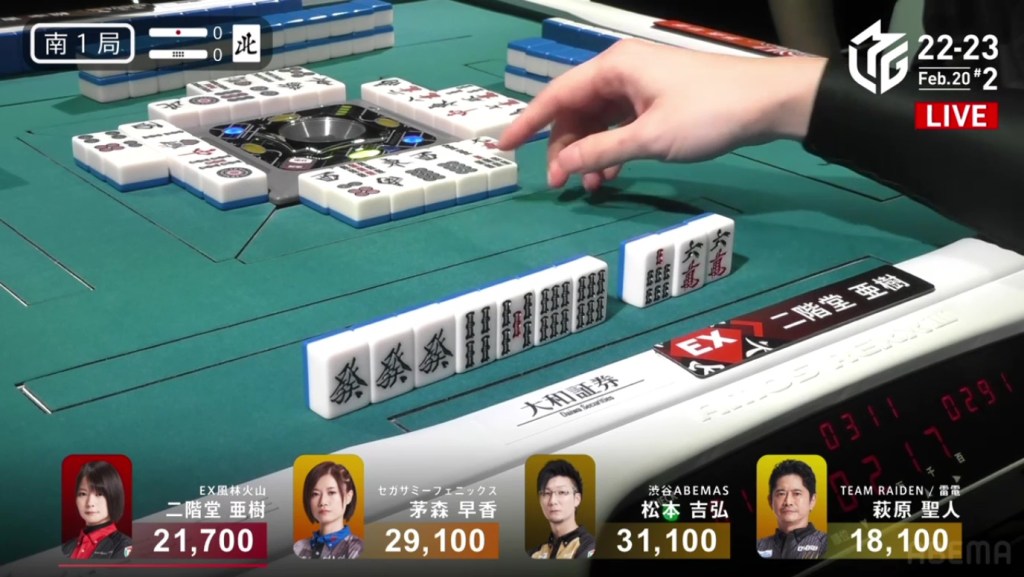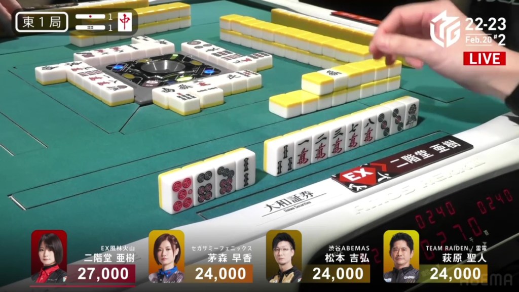 In E1-1, Matsumoto is sitting in a 3-way tie for 2nd place after Aki the dealer called riichi and was the only one tenpai at draw.
