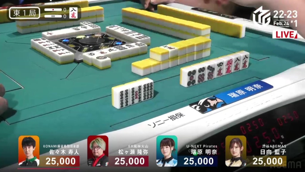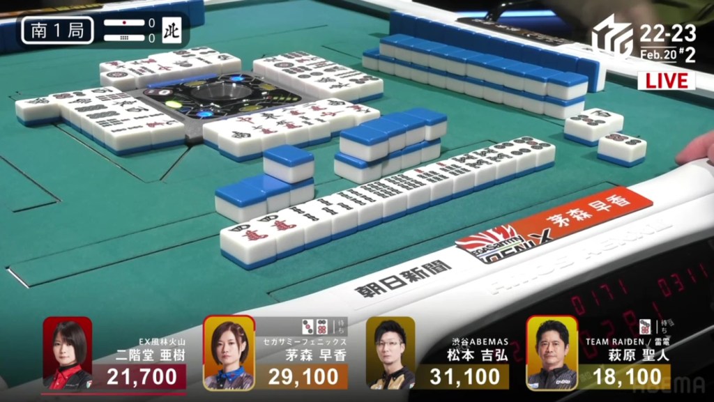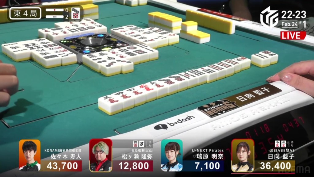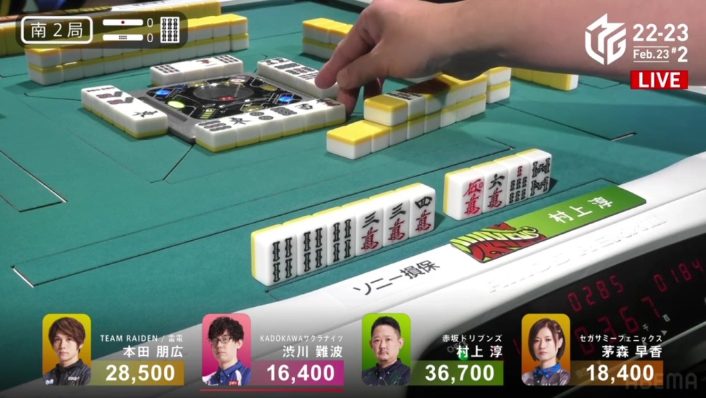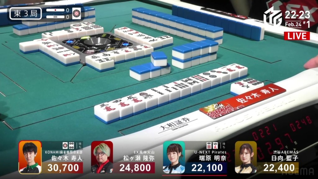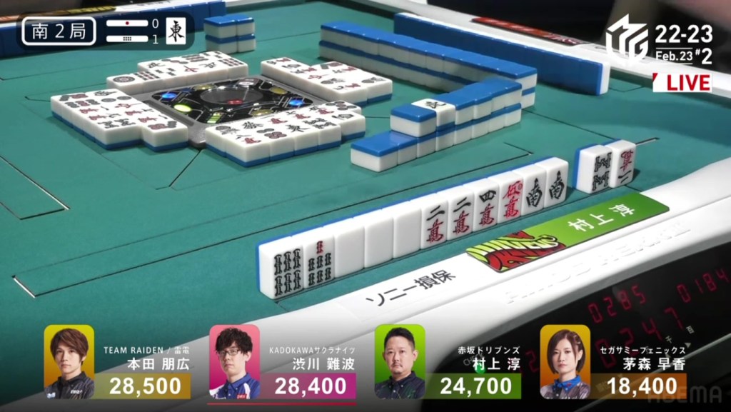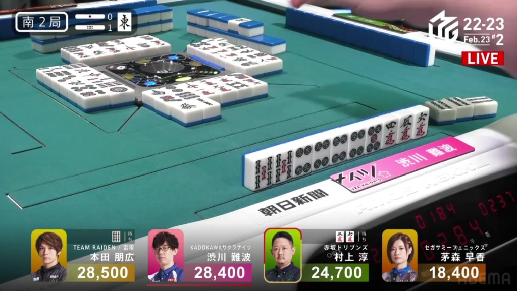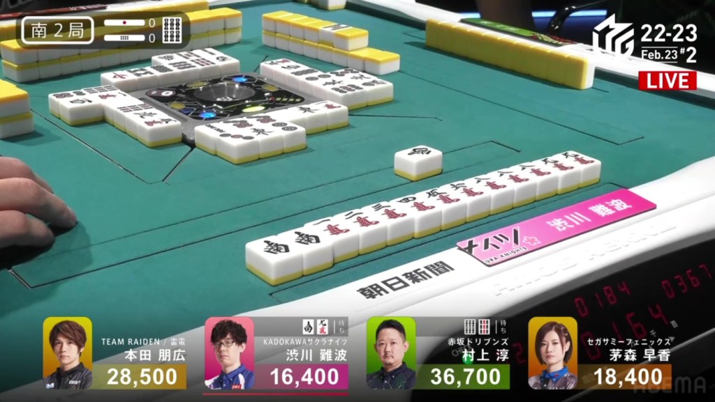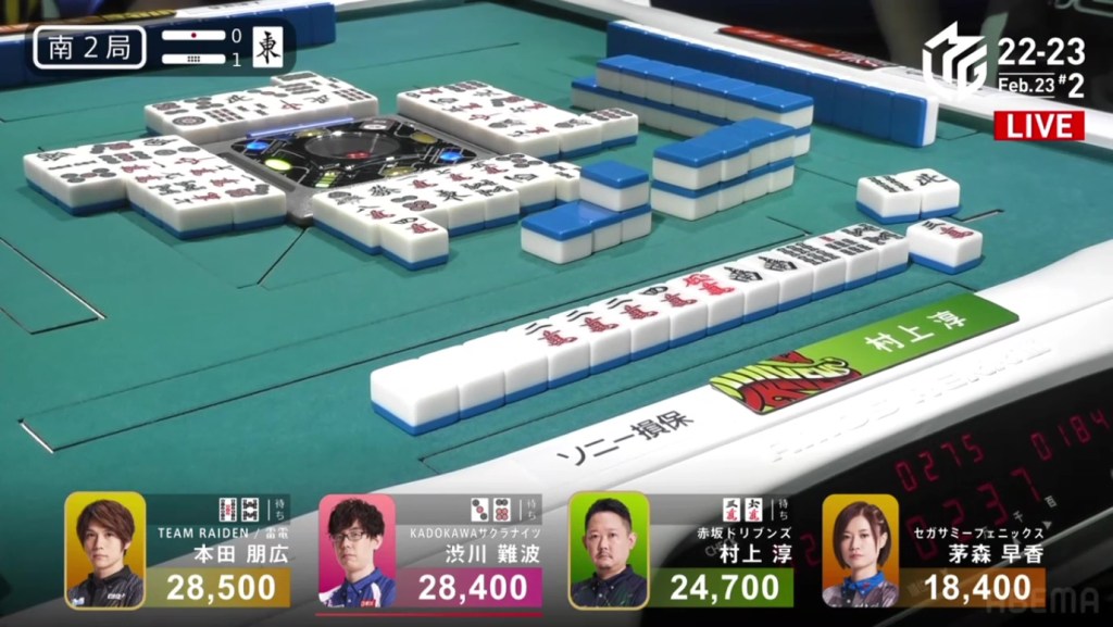 In S2-0, Shibukawa is the dealer in 4th place, 2,000 behind 3rd place Kayamori, 12,100 behind 2nd place Honda and 20,300 behind 1st place Murakami. After Hori dealt into a yakuman and got last, it’s Shibukawa’s job to save the team from doom.