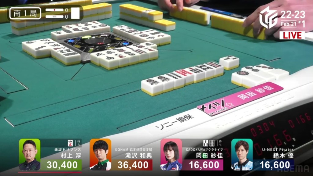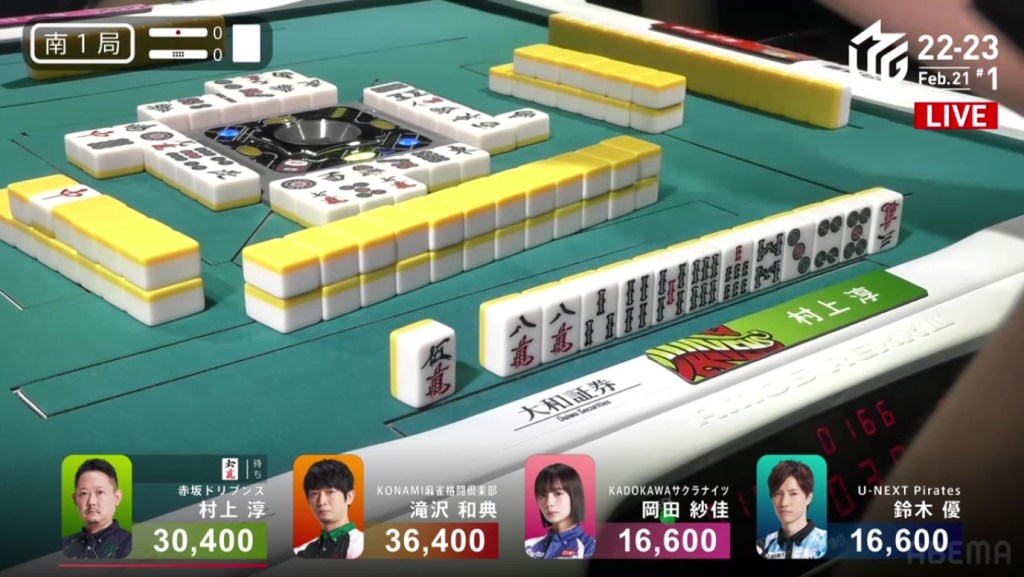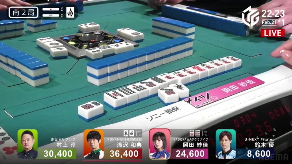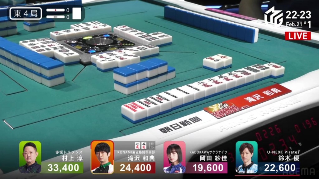 In S2-0, Okada is now just 5,800 behind 2nd place, needing only a mangan to overtake. She starts out with a big starting hand, being iishanten from the very beginning and waits on 10 different tiles for tenpai and having a chance at a 567 sanshoku with a 5p or 6p draw. Okada quickly gets another draw as Yu discards the red dragon and Takizawa calls pon, skipping Murakami’s turn. On Okada’s next turn, she draws the 8p and calls riichi on a 69p ryanmen before Murakami even gets his first draw. Takizawa tries to rush the hand quickly with more calls to get to tenpai on an east/west shanpon, but his very early riichi ends up too slow. On Takizawa’s next draw, he draws and discards the 6p and deals into Okada. Okada wins the hand with Riichi/Pinfu/Aka 1/Ura 1 for 8,000 to move her into 1st place.