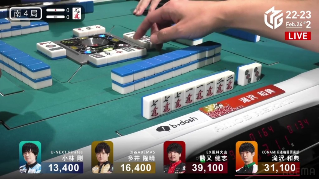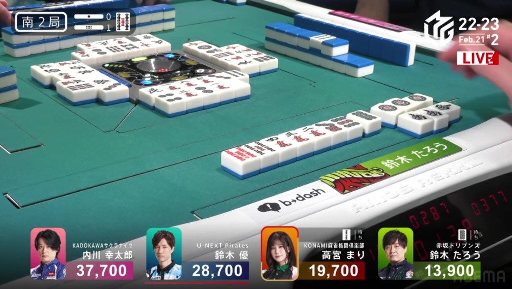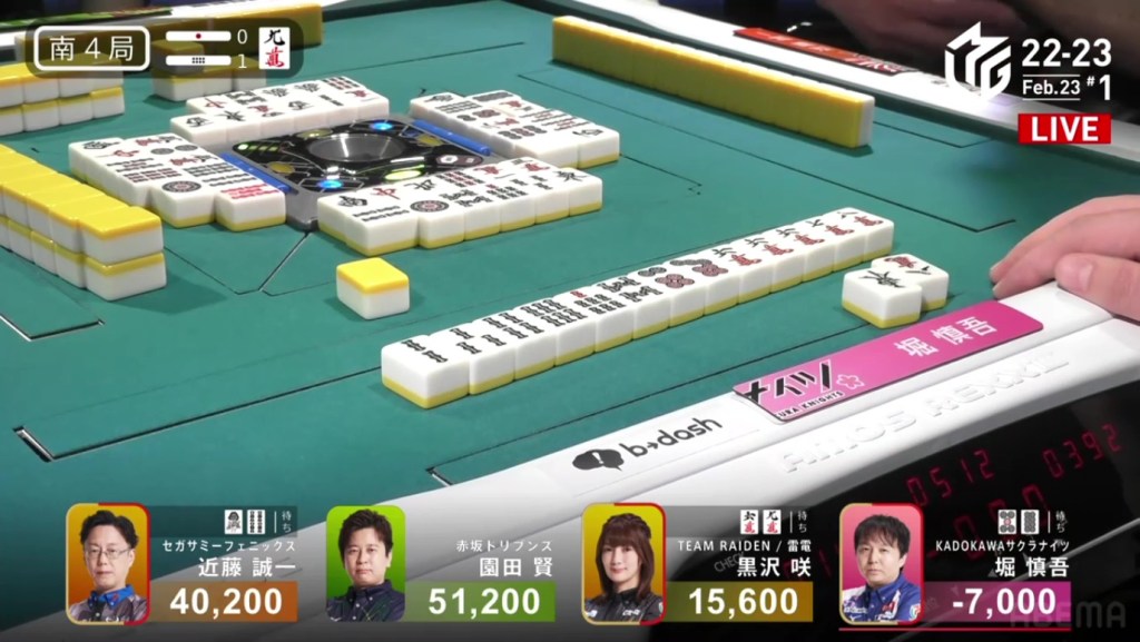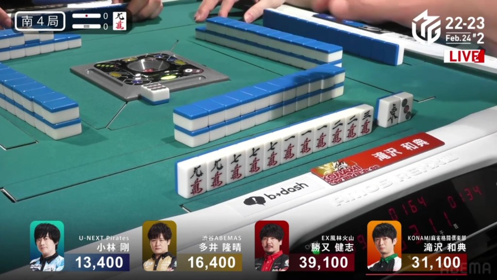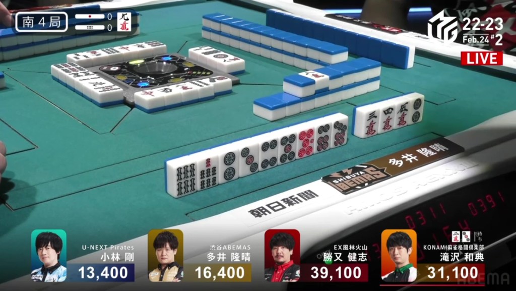 In S4-1, Hori is deep into the negatives at -7,000 after dealing into a mangan in S3-0. However, he does have the last dealership, giving him a chance to make a last-minute comeback. However, he will have to find 22,600 in order to move into 3rd place.