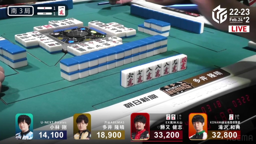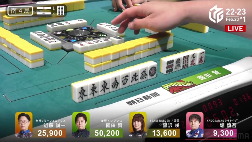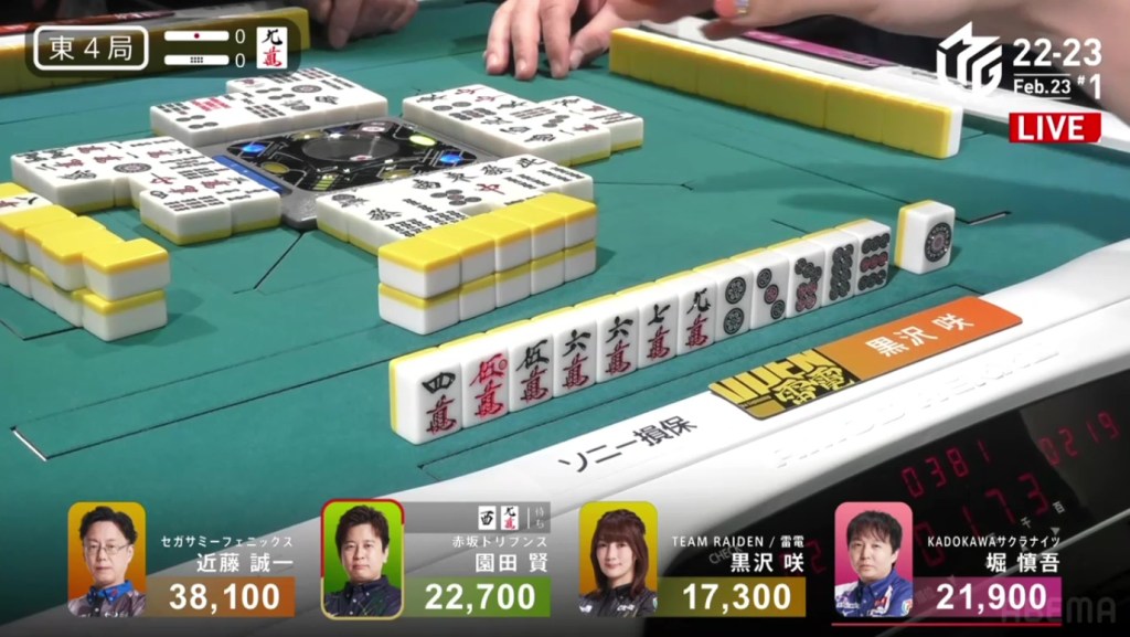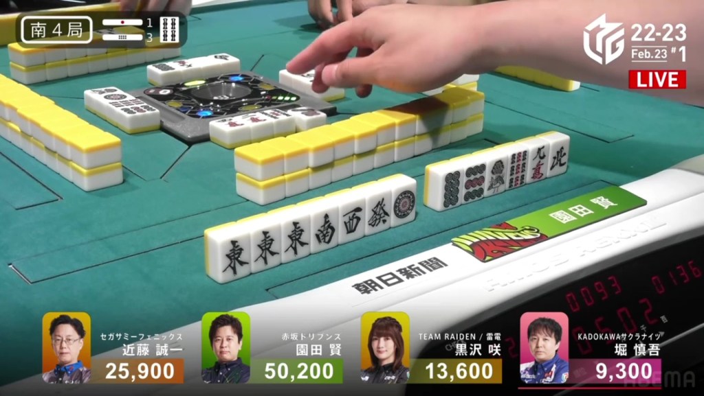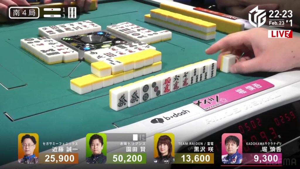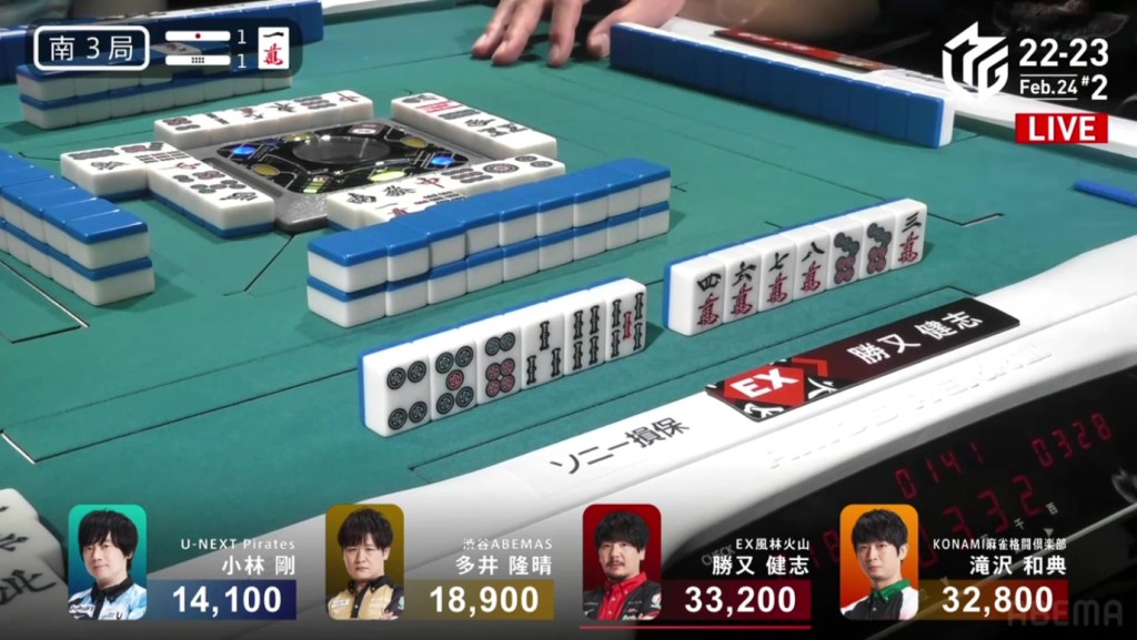 Though Hori is the dealer and the first to call riichi, the other players around the table didn’t seem scared. In the middle of the second row, Kurosawa gets to tenpai on an 8m tanki and Kondo gets to tenpai and calls riichi on a 14s ryanmen. If Kondo can draw the 4s himself, he would win the game by 400.