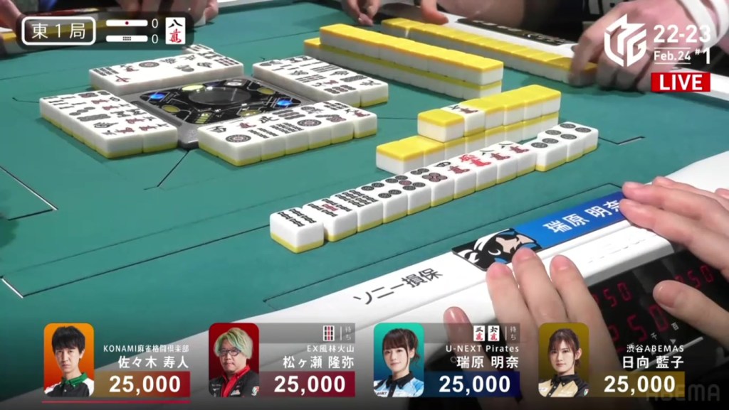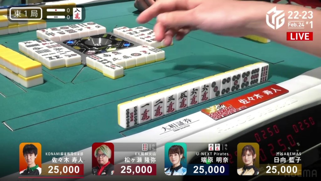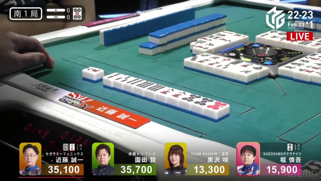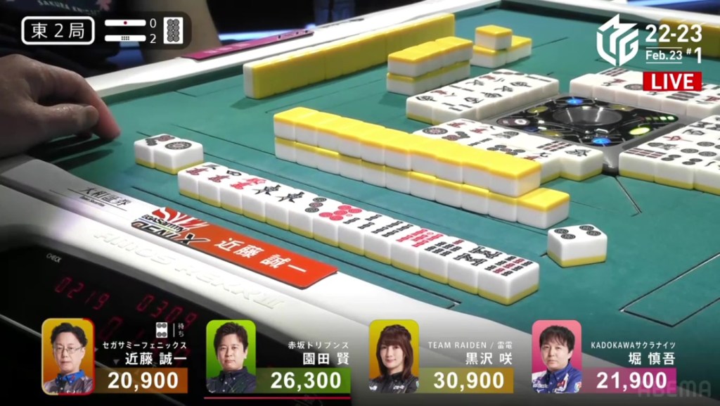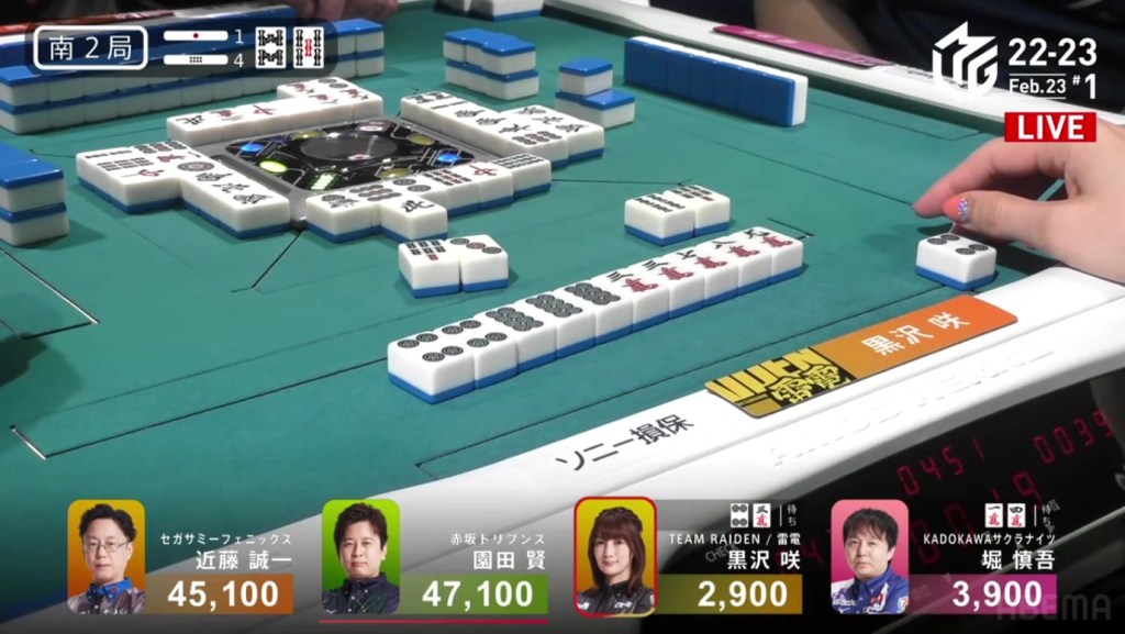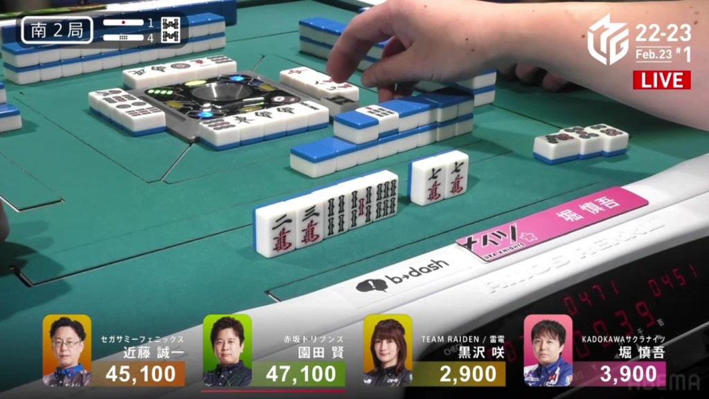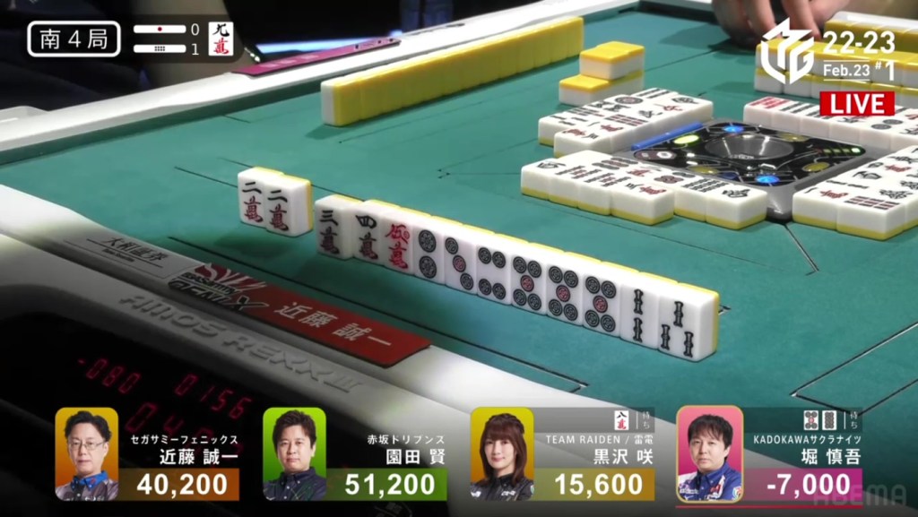 Though Hori is the dealer and the first to call riichi, the other players around the table didn’t seem scared. In the middle of the second row, Kurosawa gets to tenpai on an 8m tanki and Kondo gets to tenpai and calls riichi on a 14s ryanmen. If Kondo can draw the 4s himself, he would win the game by 400.