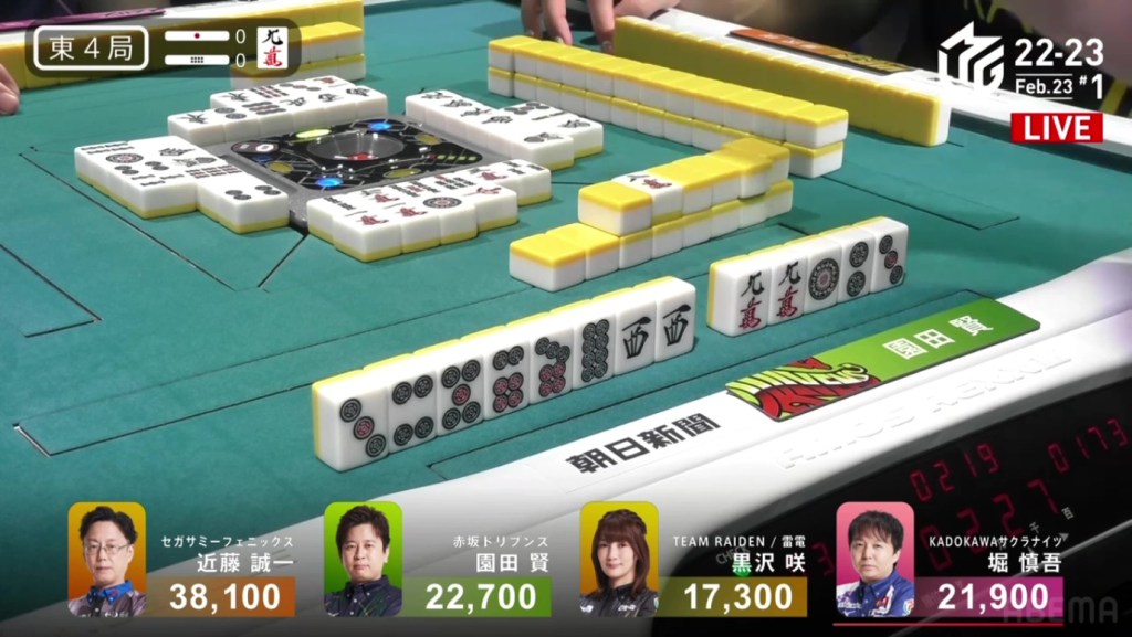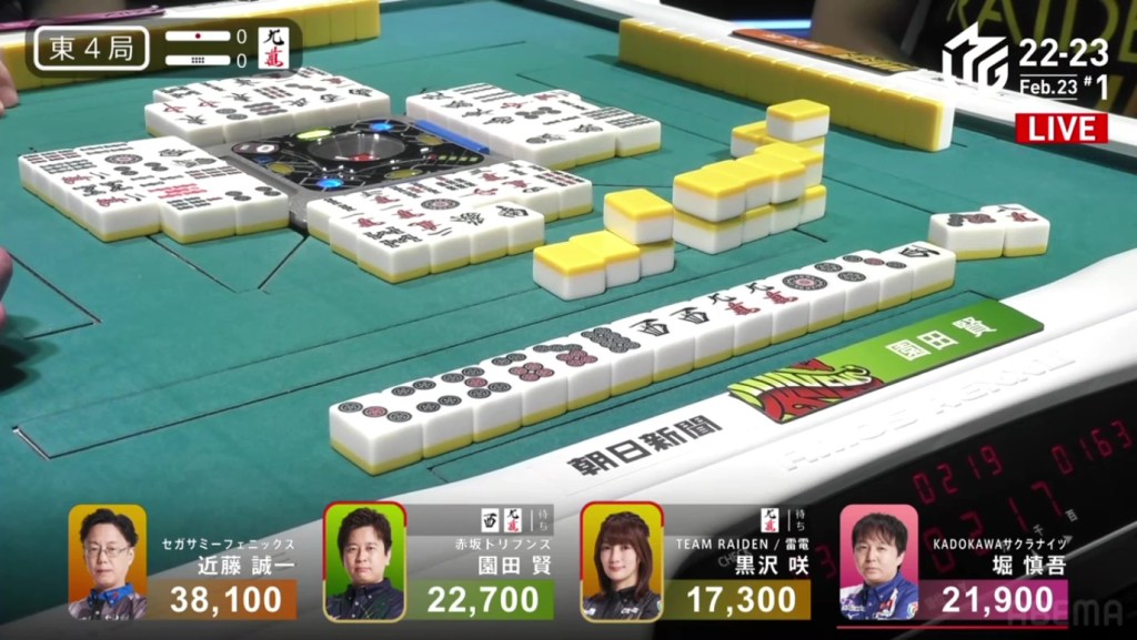 Three riichi calls on the table, 6 types of tiles that can end the hand. Soon after Kurosawa calls riichi, Kondo draws and discards Hori’s takame 8p and wins the hand. Hori wins the hand with Riichi/Pinfu/Tanyao/Sanshoku for 12,000+300 plus two riichi sticks, putting Hori back into the positives.