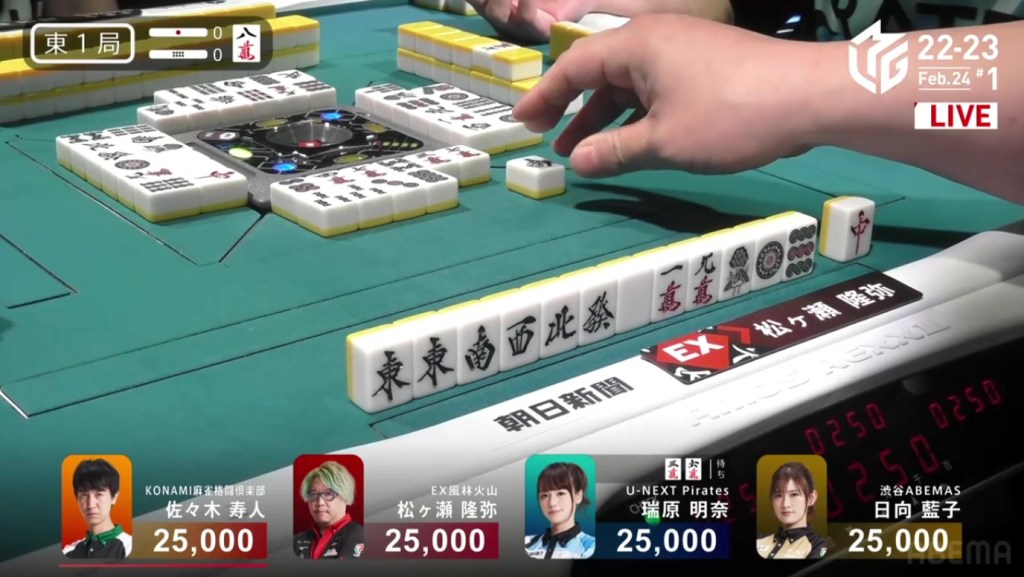 The game starts out with Matsugase in the south seat and Mizuhara in the west seat. Matsugase starts out the hand with eight terminals and honours. With a yakuman won just a day earlier, kokushi is still on everyone’s mind.
