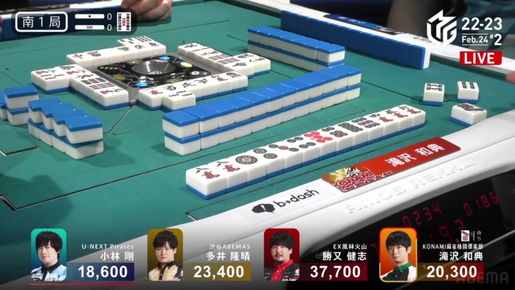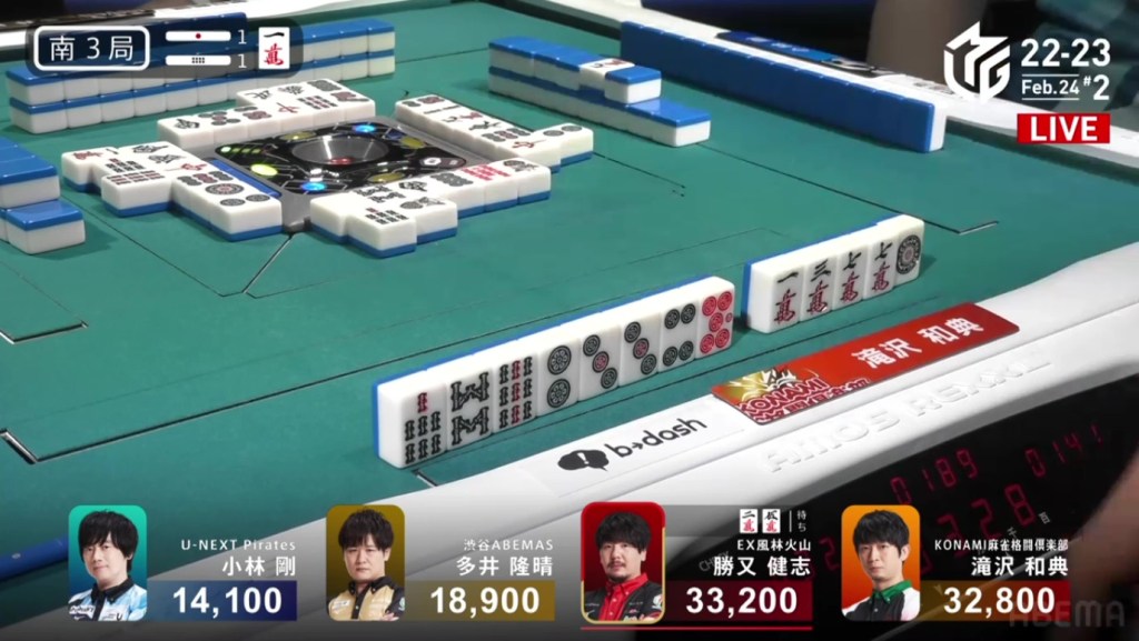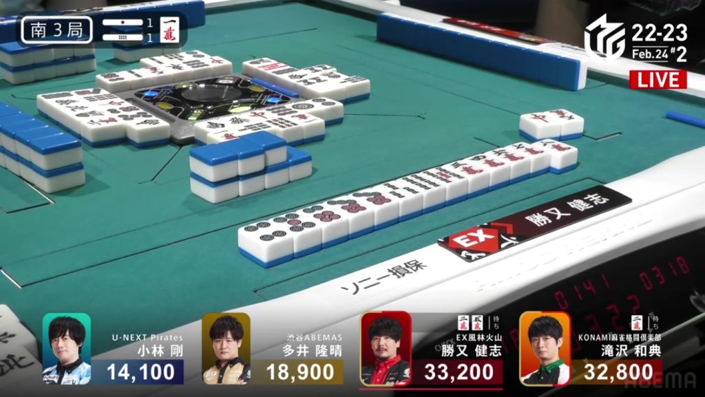 In S3-1, only 400 separates 1st place dealer Katsumata and 2nd place Takizawa. With 1,300 in bonus sticks as well, whoever wins this hand will surely have the advantage going into the last hand.
