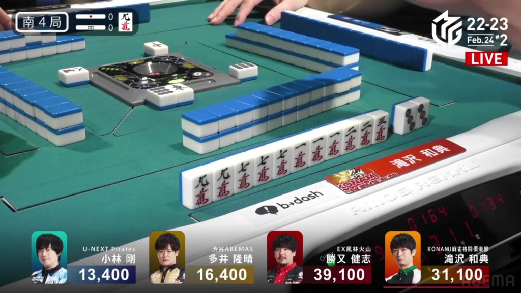 In S4-0, Takizawa is the dealer in 2nd place and is 8,000 behind 1st place. Being the last dealer, he has the chance to gain big points.