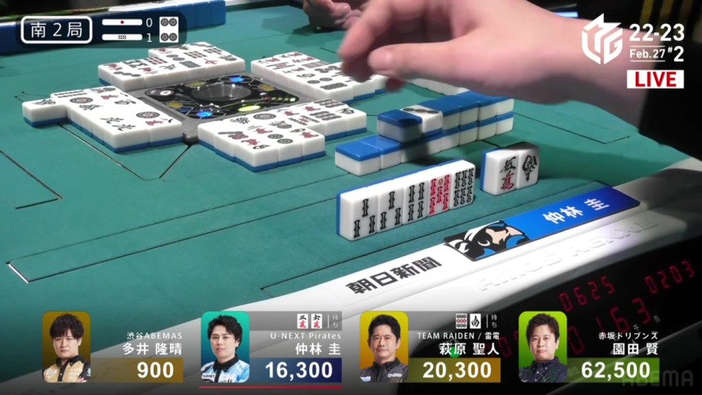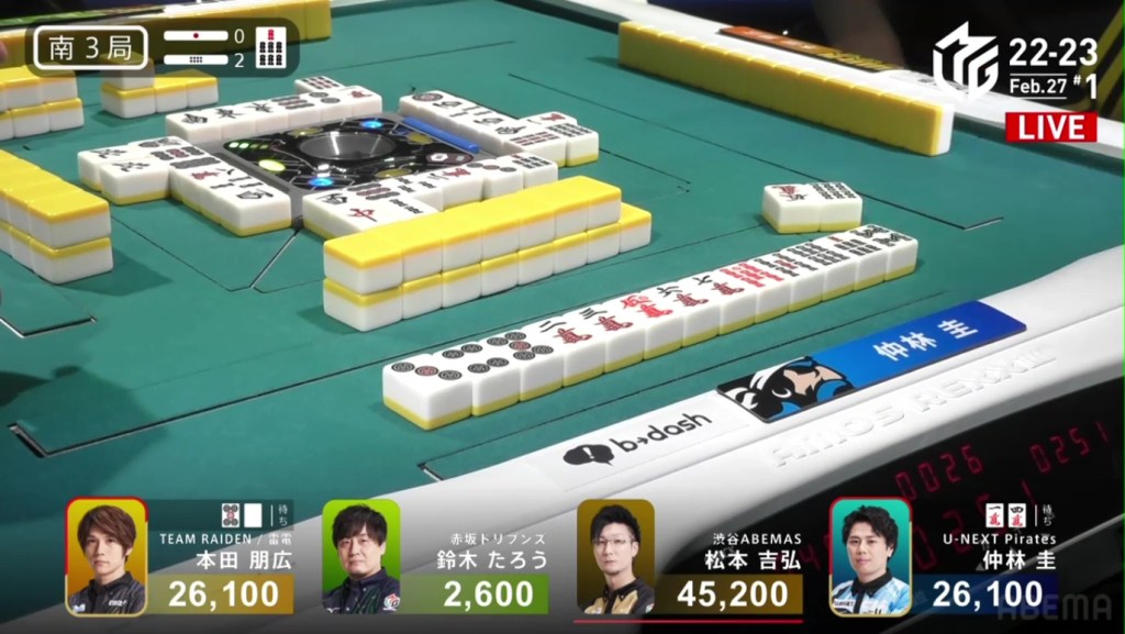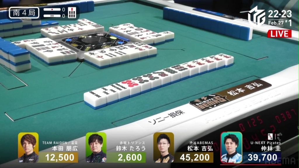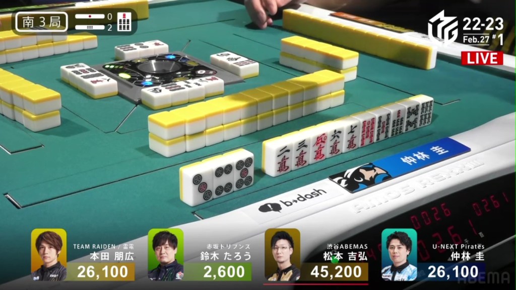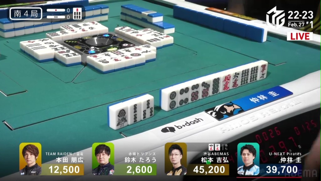 Nakabayashi wins the hand with Riichi/Pinfu/Dora 1/Aka 2 for 8,000 plus Honda’s riichi stick.