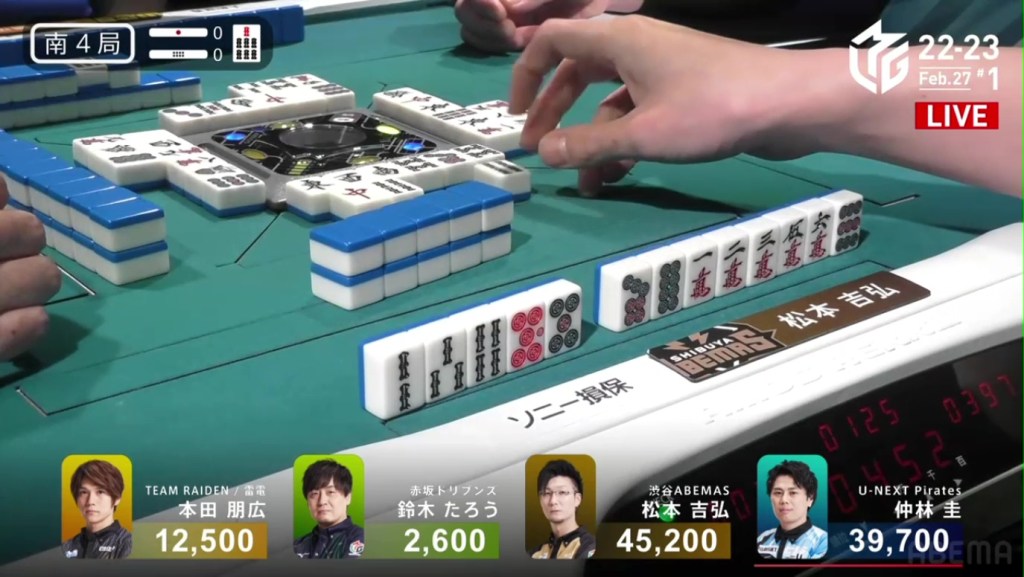Soon after, Nakabayashi gets to tenpai on a 5m/3s shanpon. With a call in the third row, he improves the wait to a 36m ryanmen. Unfortunately for Nakabayashi, he draws a south just two turns later and is forced to fold.