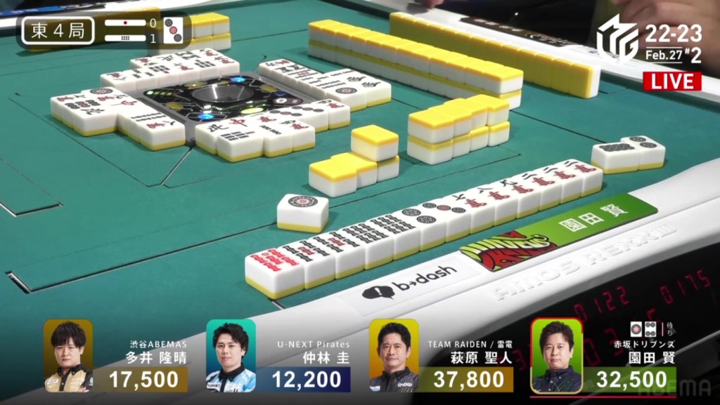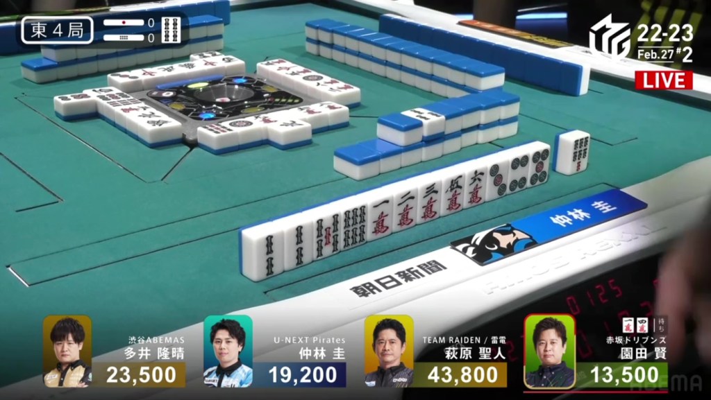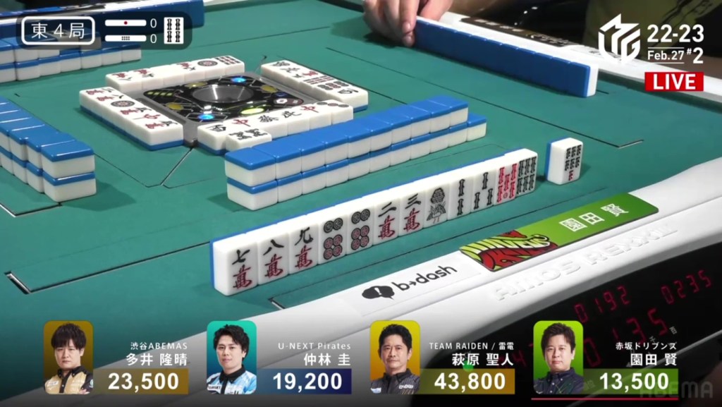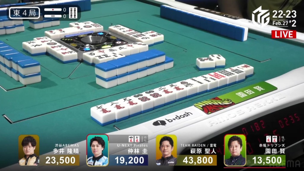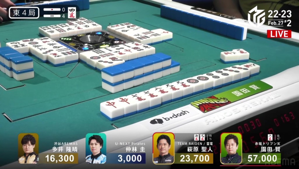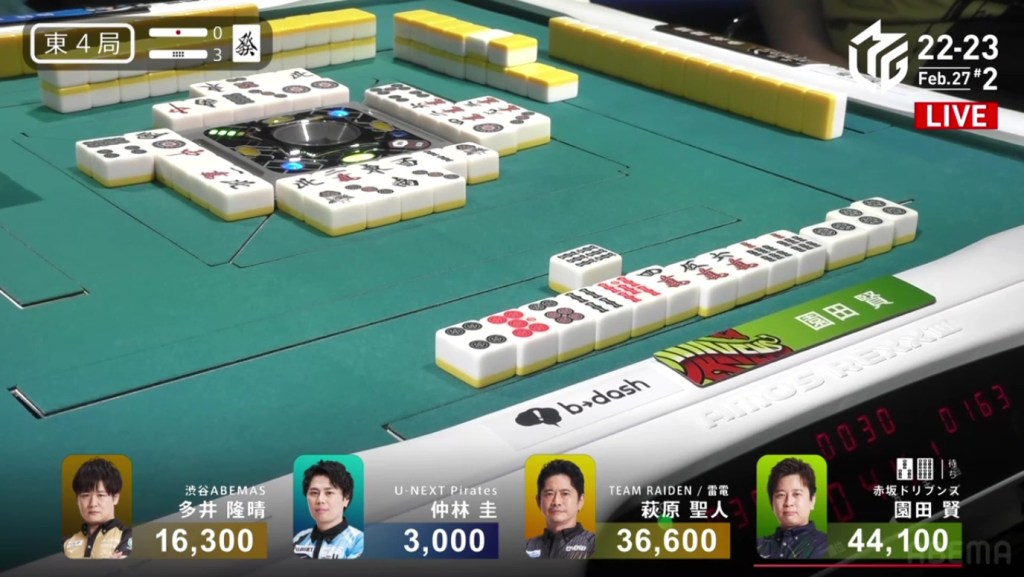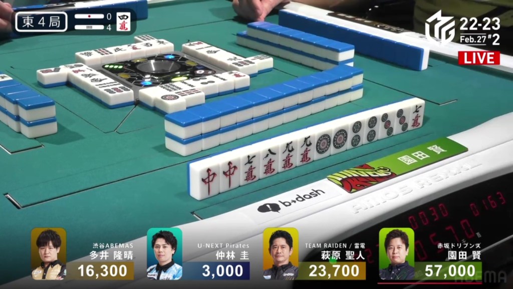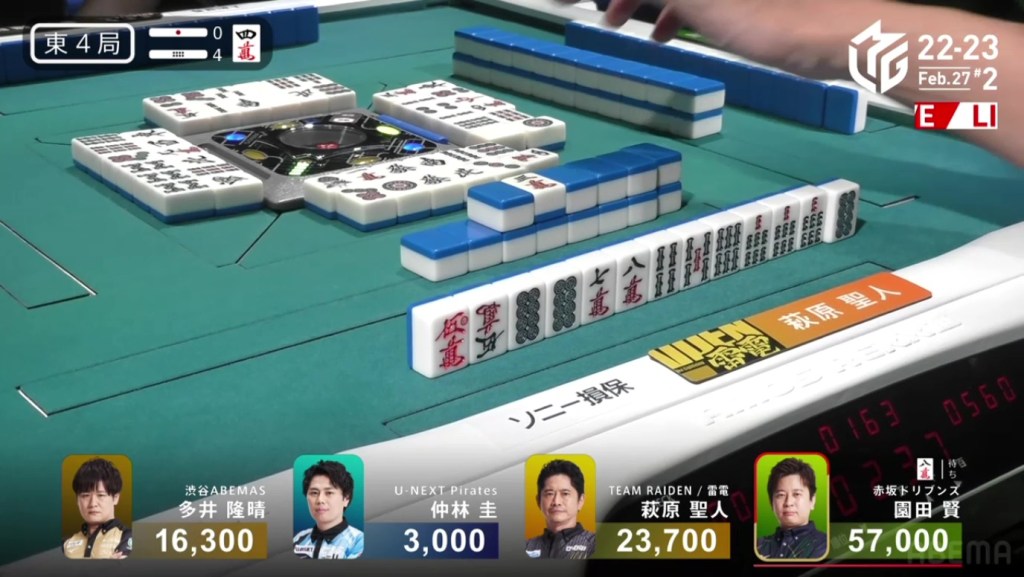 In E4-0, Sonoda is sitting in last place, 5,700 behind 3rd place Nakabayashi and 10,000 behind 2nd place Ooi. He did win the previous hand, so he does have some forward momentum working for him.