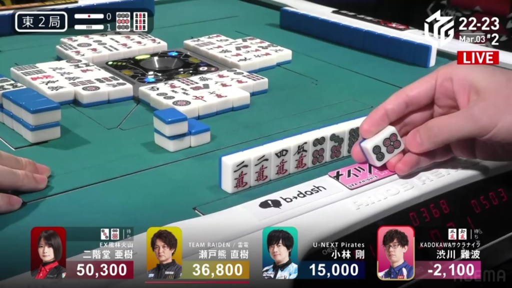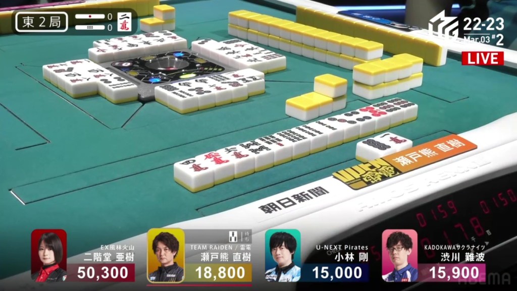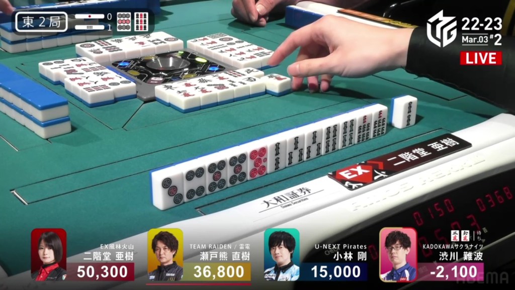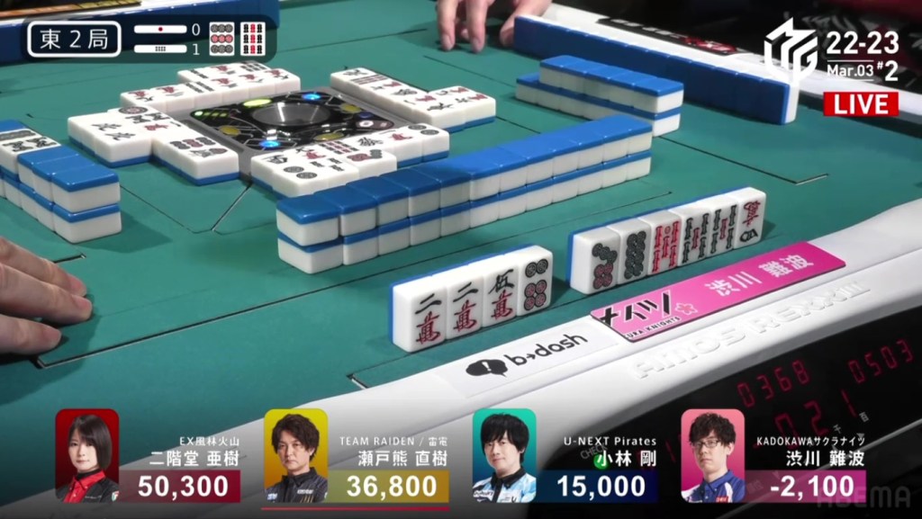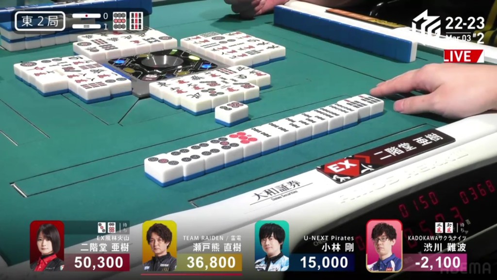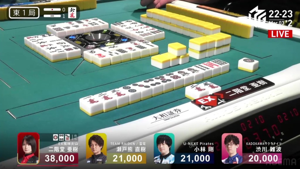 In E2-0, Setokuma is the dealer in 2nd place, 31,500 behind 1st place Aki. The team is currently in 6th place and they want to put as much space between them and 7th.