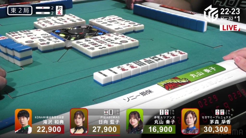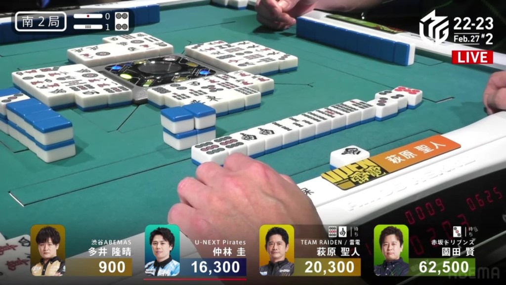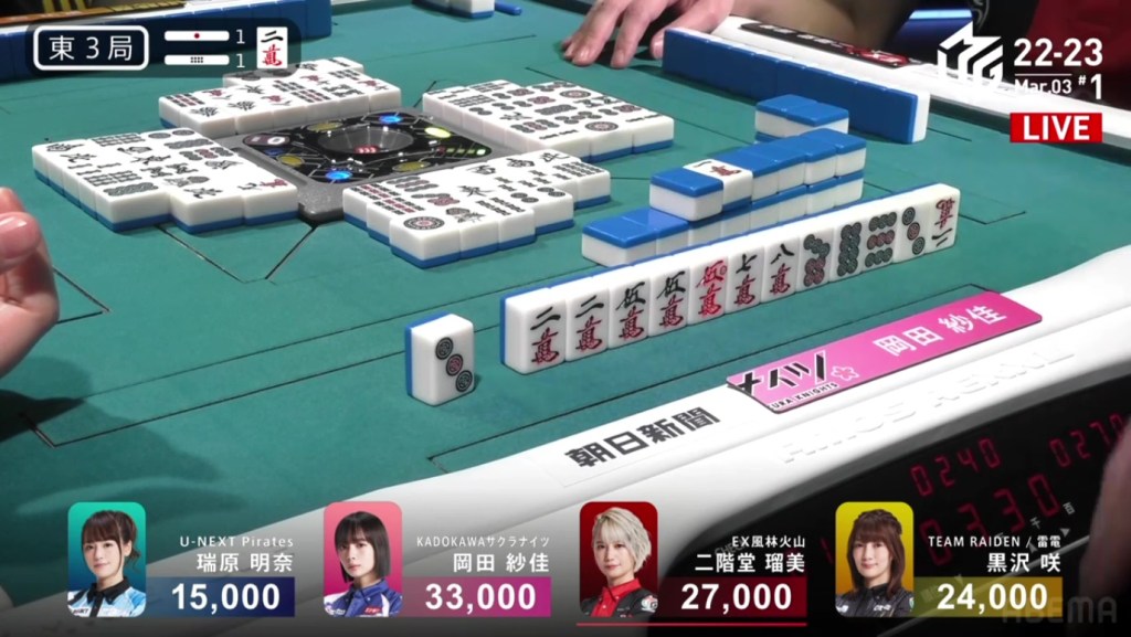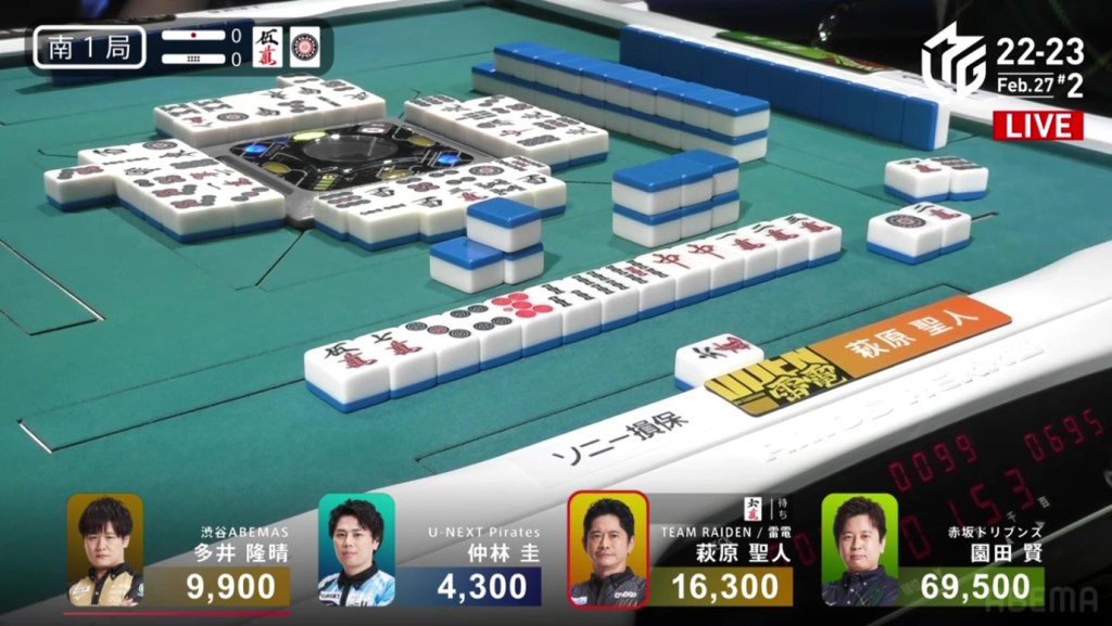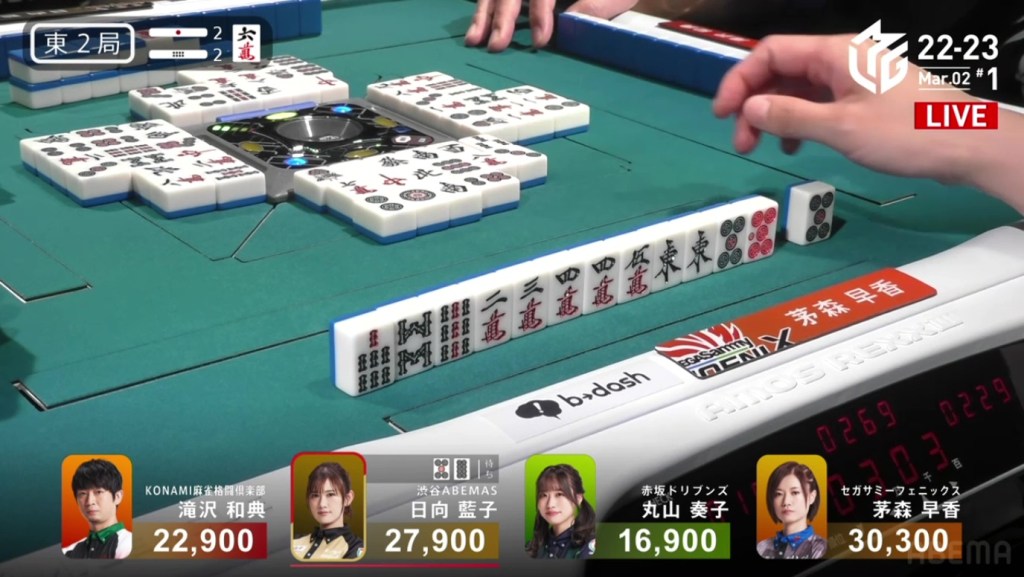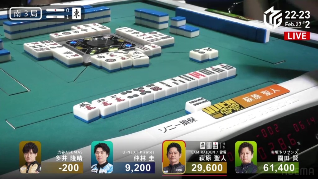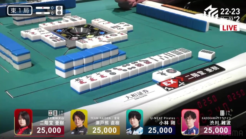 In E2-0, Setokuma is the dealer in 2nd place, 31,500 behind 1st place Aki. The team is currently in 6th place and they want to put as much space between them and 7th.