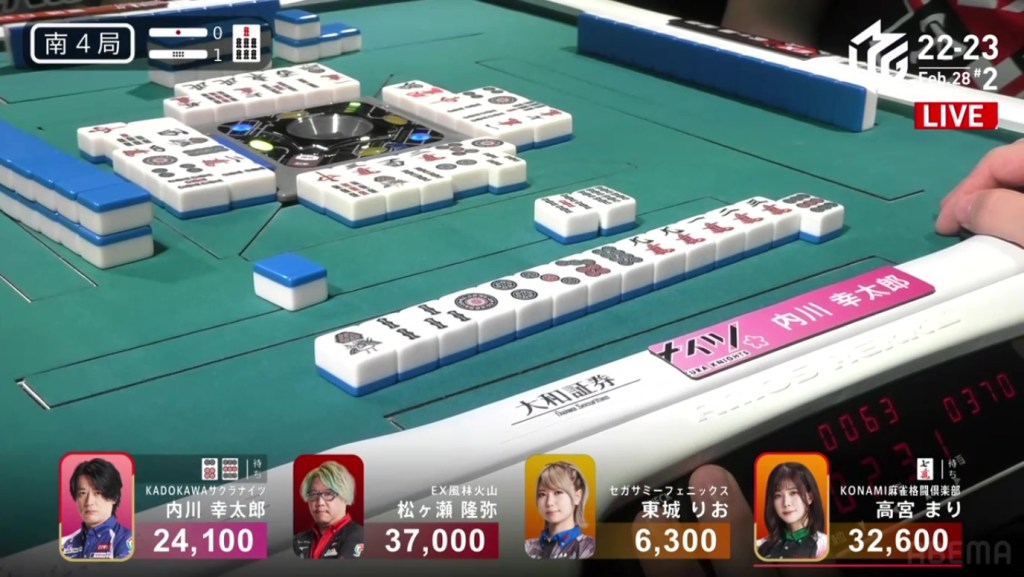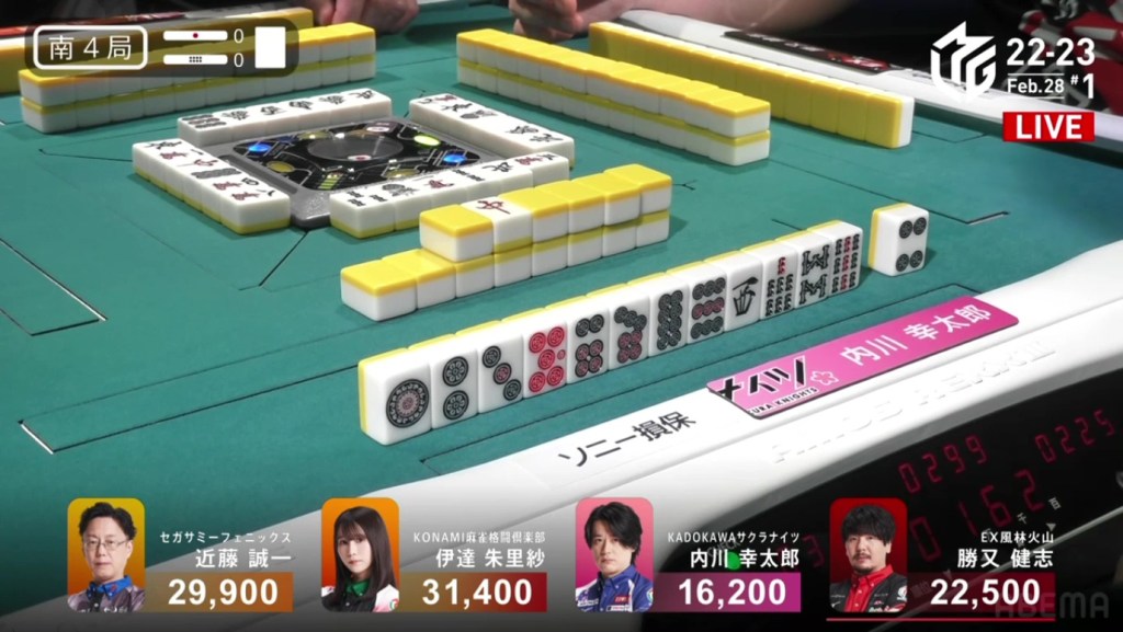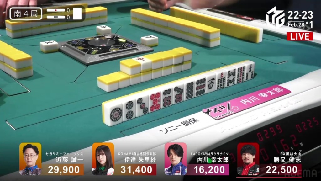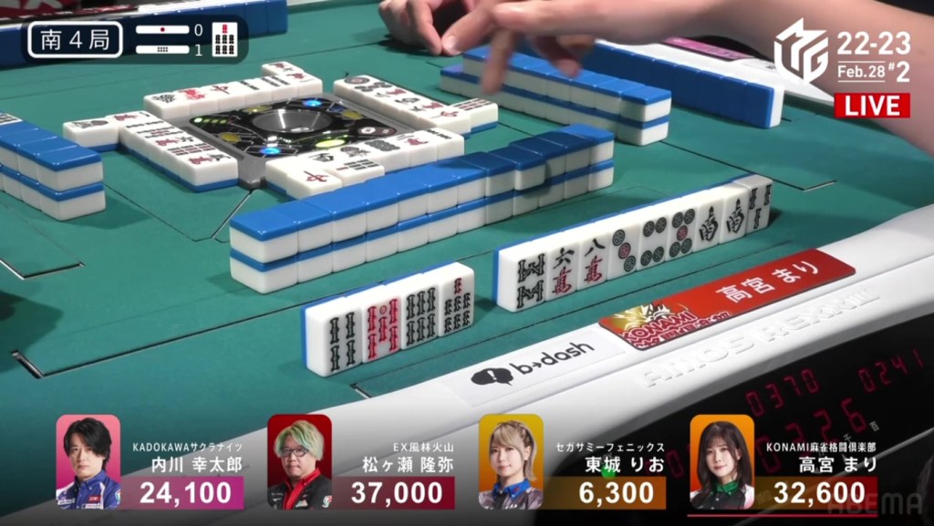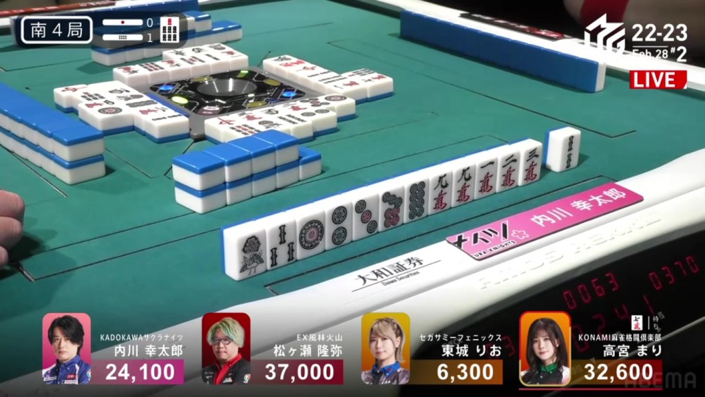 Being in 3rd place, far from 4th and holding a potential comeback hand, Uchikawa pushes his hand. In the middle of the second row, Uchikawa draws the 2s. He calls riichi and waits on a 69p ryanmen. If he wins off the 9p, draws the 6p and finds one extra han, or calls ron on the 6p and finds two extra han, he will take 1st place because of Takamiya’s riichi stick.