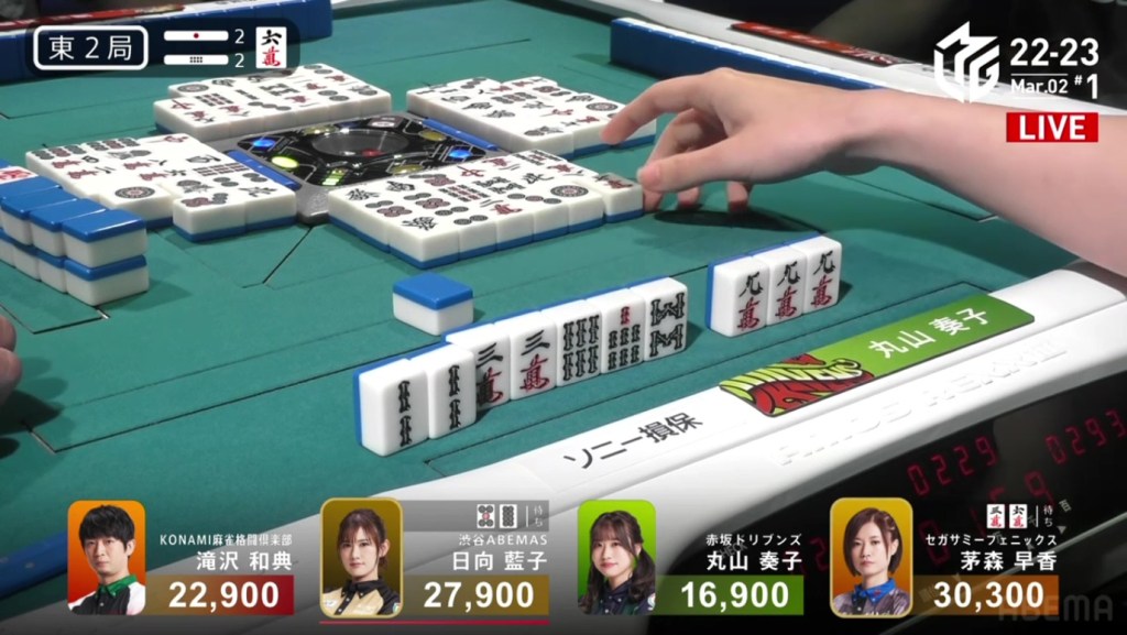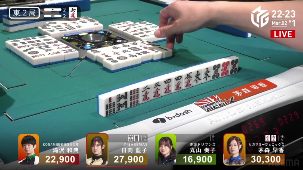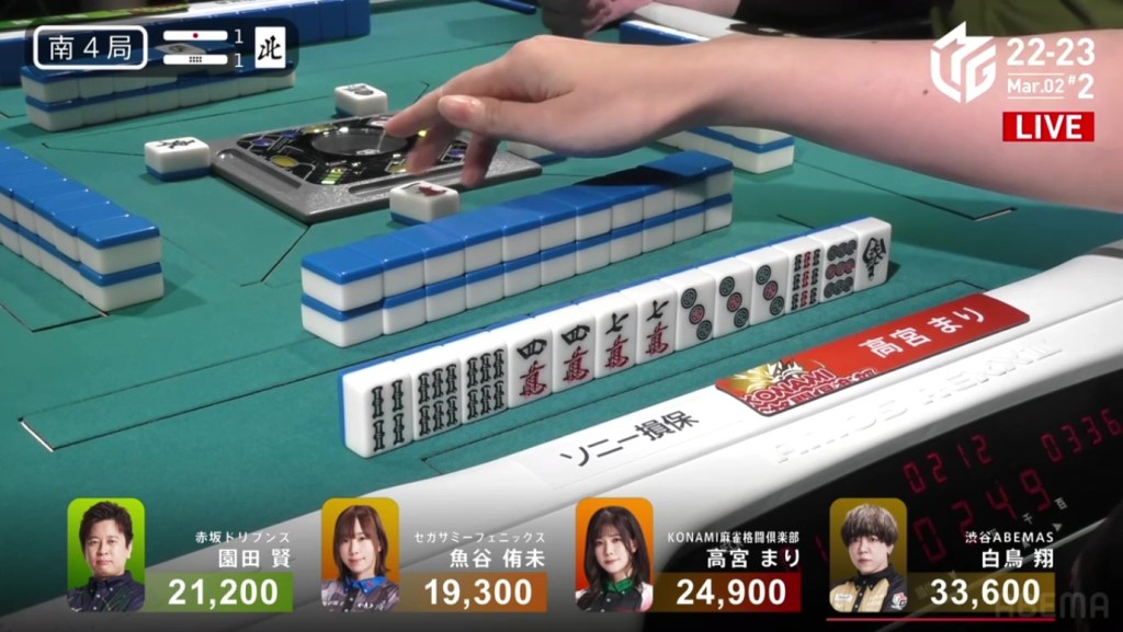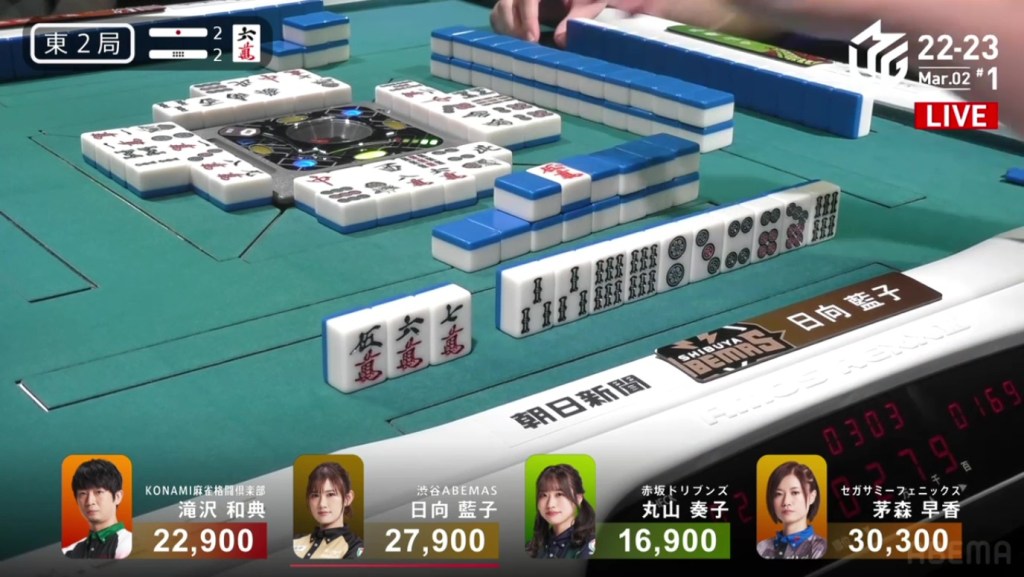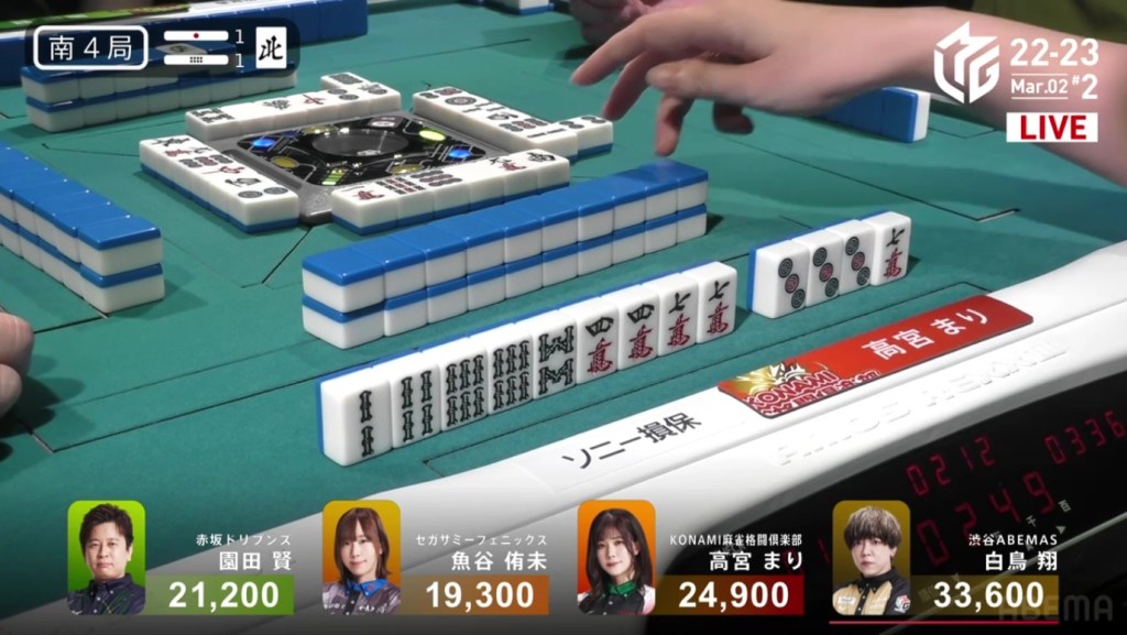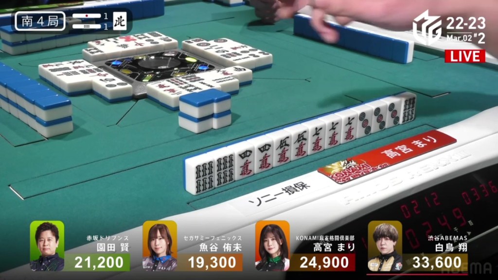 Being in 3rd place, far from 4th and holding a potential comeback hand, Uchikawa pushes his hand. In the middle of the second row, Uchikawa draws the 2s. He calls riichi and waits on a 69p ryanmen. If he wins off the 9p, draws the 6p and finds one extra han, or calls ron on the 6p and finds two extra han, he will take 1st place because of Takamiya’s riichi stick.