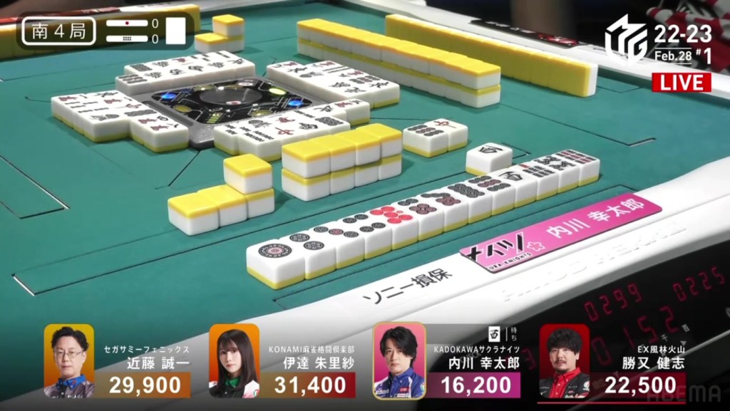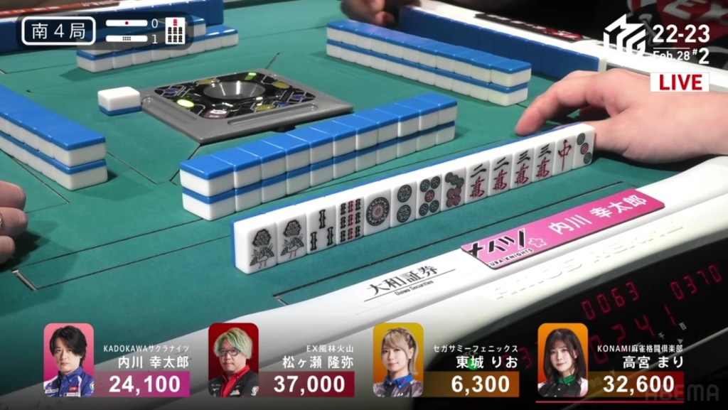 In S4-0, Uchikawa is in 4th place, 6,300 behind 3rd place Katsumata, 13,700 behind 2nd place Kondo and 15,200 behind 1st place Date. A baiman for 1st or a haneman tsumo for 2nd would be nice, but they are a bit difficult to achieve. More reasonably, a mangan win is enough for at least 3rd, with a direct hit off Kondo or Date being enough to move into 2nd.