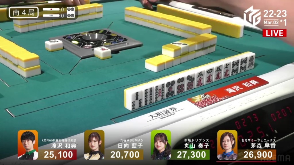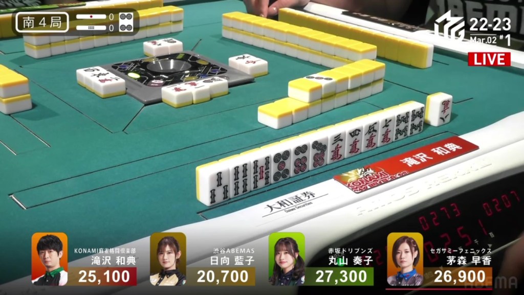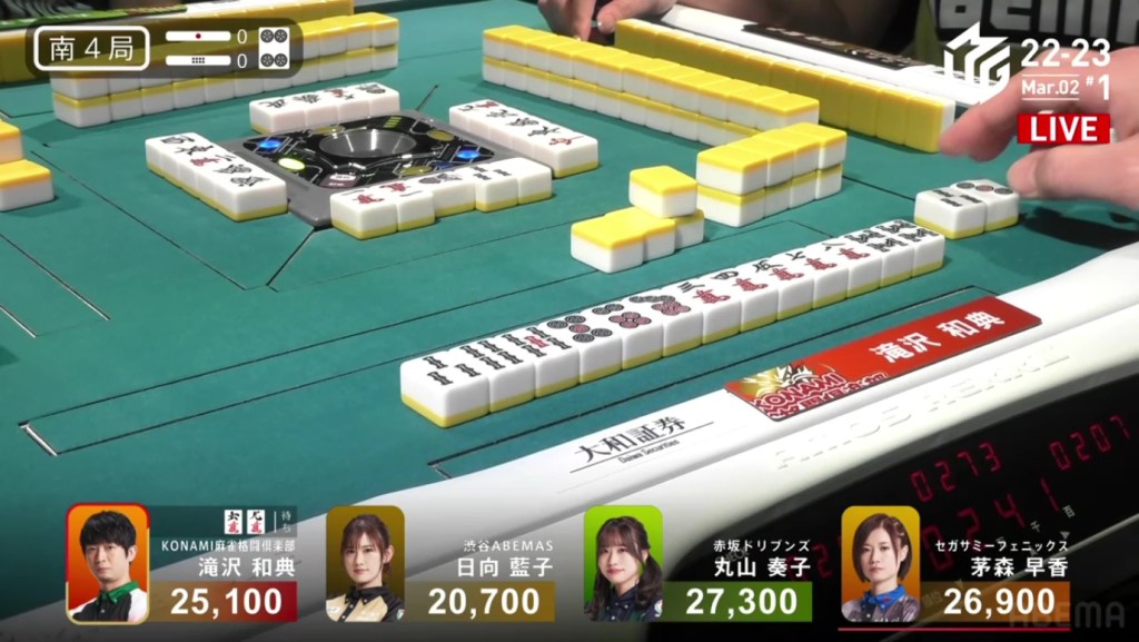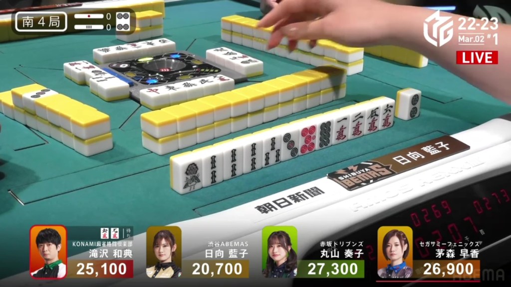 In S4-1, Takamiya is in 2nd place and 8,700 behind 1st place dealer Shiratori. With 1,300 in bonus sticks available, she would need a mangan indirect, a 3/30 direct or a 3/40 tsumo for 1st place.