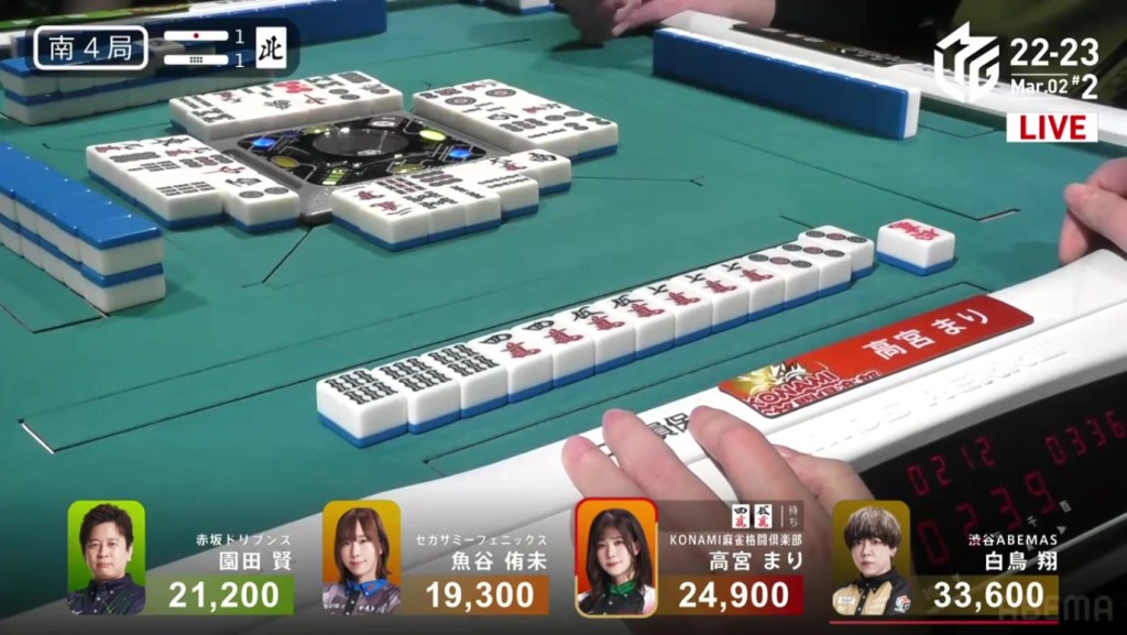 Two 4m and one 5m sit in the wall. Three tiles that Takamiya can draw to get the league’s third yakuman in as many weeks. On Takamiya’s next draw, on the ippatsu turn, Takamiya finds the red 5m and completes the yakuman! Takamiya wins with Suuankou for 8,000+100/16,000+100 plus one riichi stick to win the game. With the third yakuman in around 16 days, this is the shortest span of three yakuman since the three yakuman in 8 days during February-March 2020.