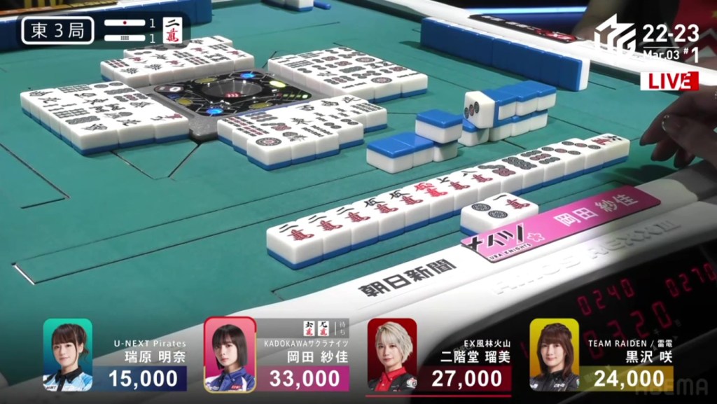 With the last tile being her winning tile, Maruyama now has a yaku and calls ron. Maruayama wins with Houtei/Aka 1 for 2,000+600 plus four riichi stick, enough to move into 3rd place.
