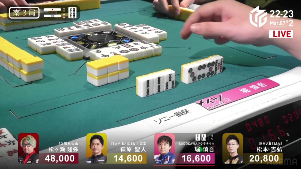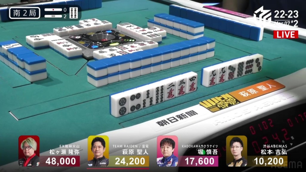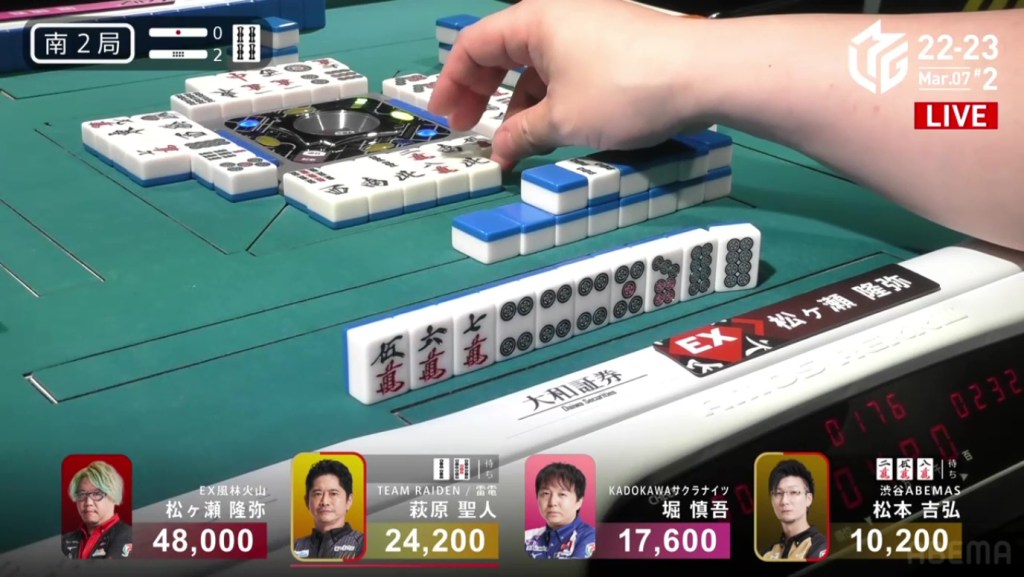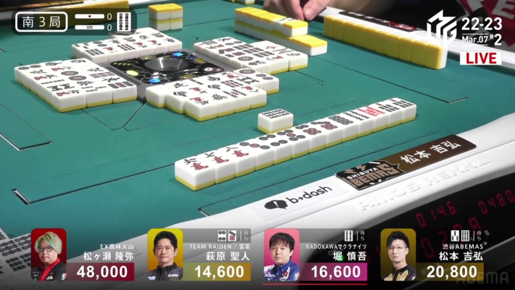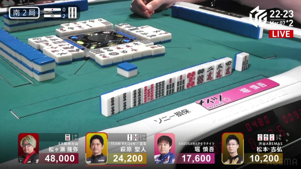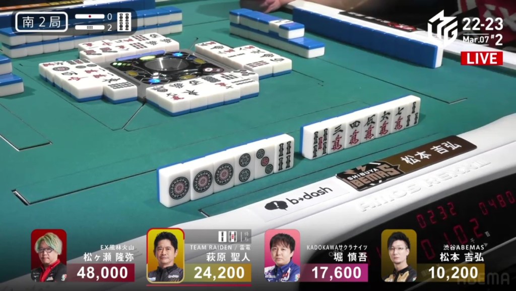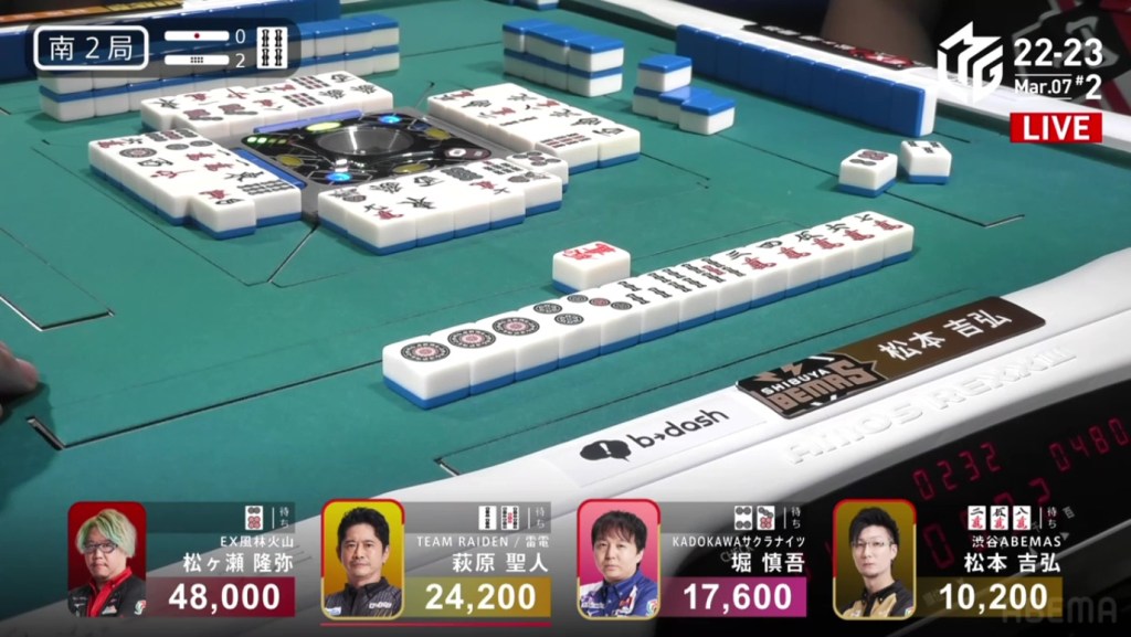 In S2-2, Matsumoto is in 4th place, 7,400 behind 3rd place Hori and 14,000 behind 2nd place Hagiwara. After dropping down to 5th place the game before, Matsumoto needs to gain points to spot the team from sinking down even further.