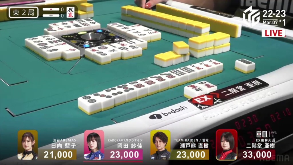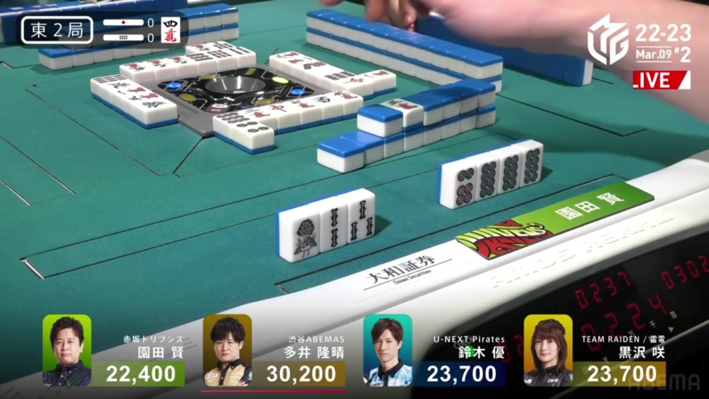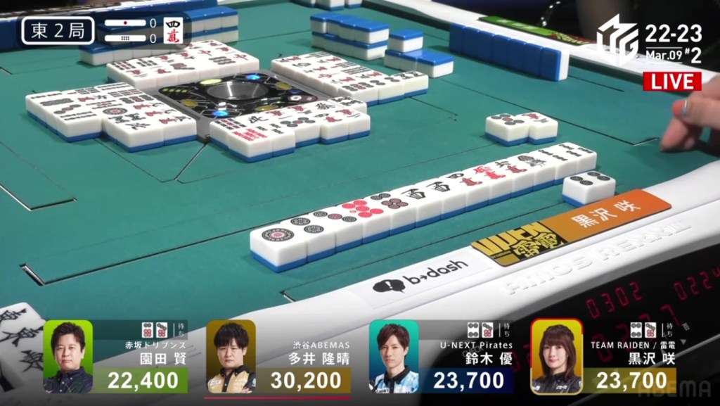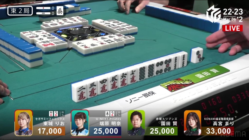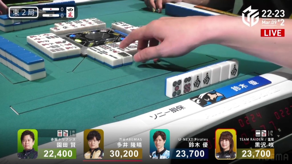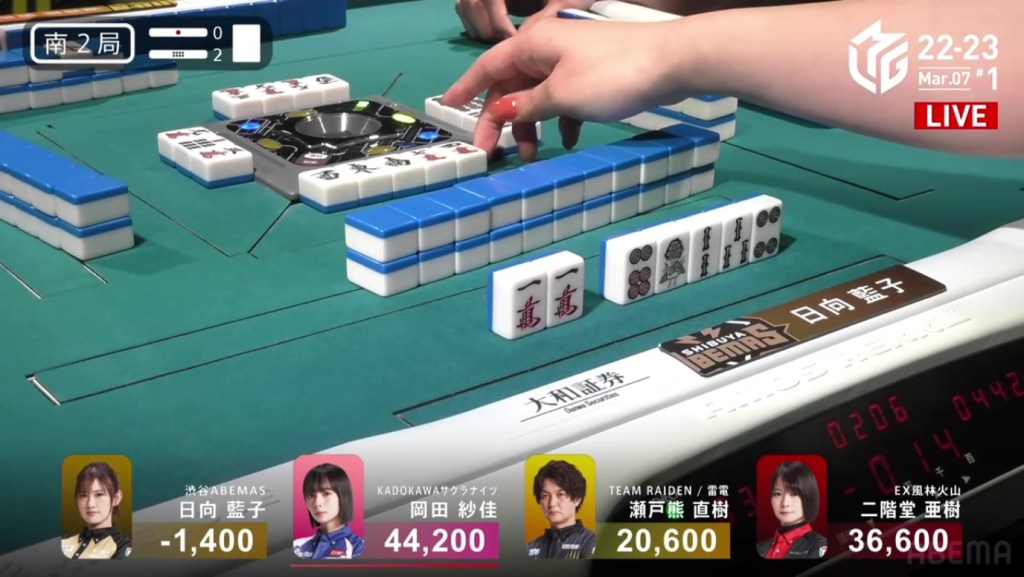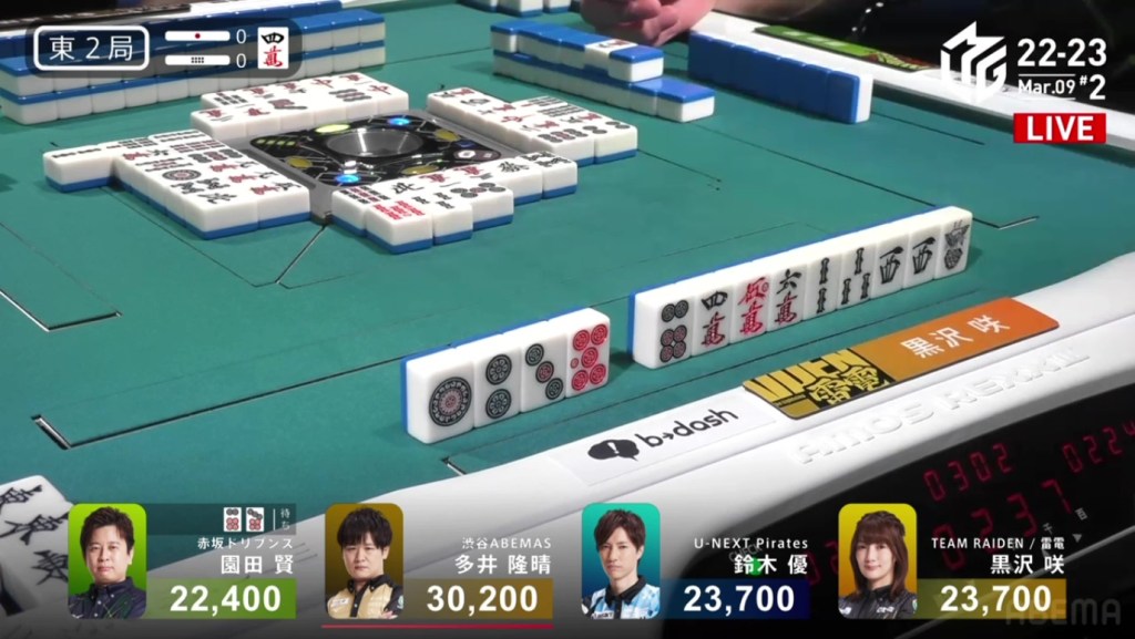In S2-2, Matsumoto is in 4th place, 7,400 behind 3rd place Hori and 14,000 behind 2nd place Hagiwara. After dropping down to 5th place the game before, Matsumoto needs to gain points to spot the team from sinking down even further.