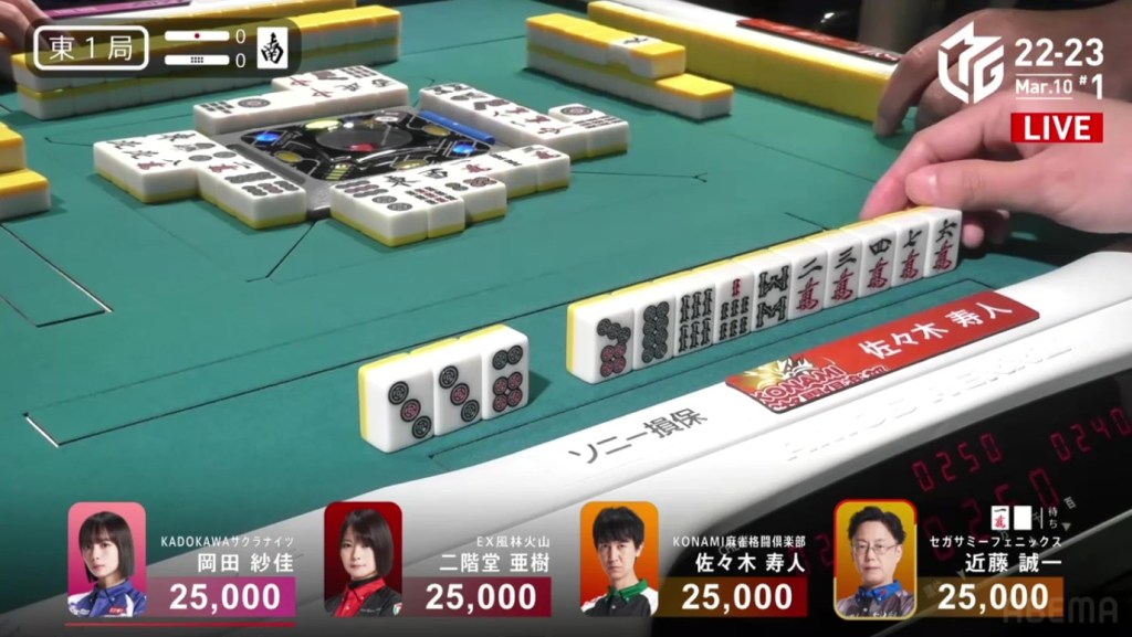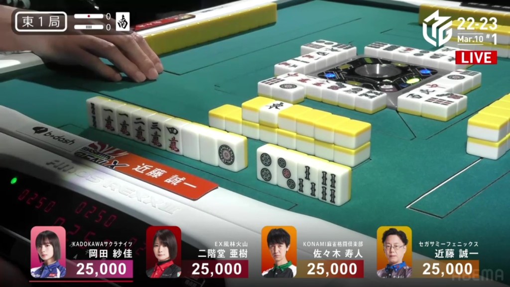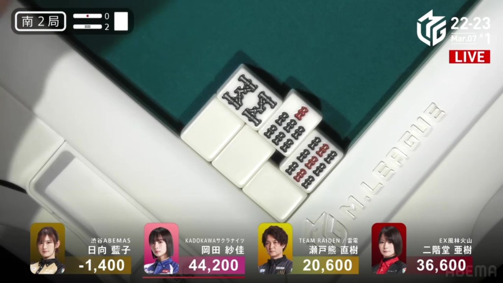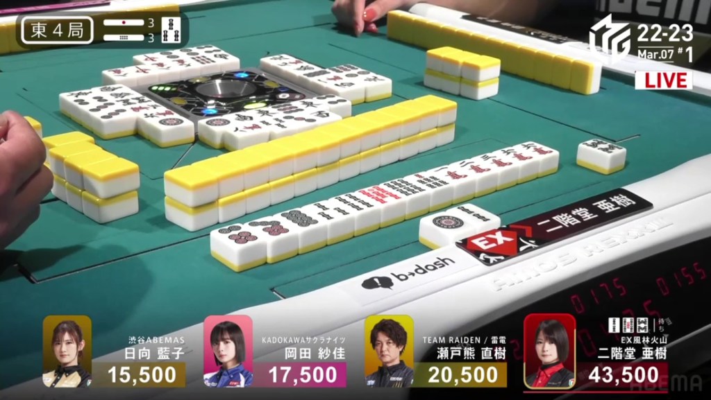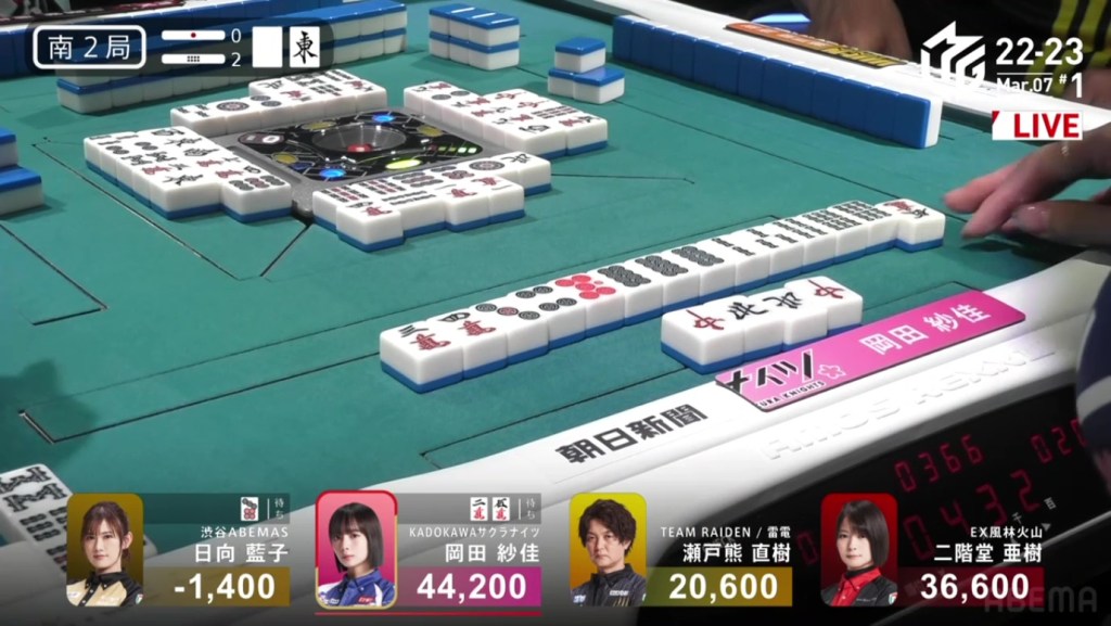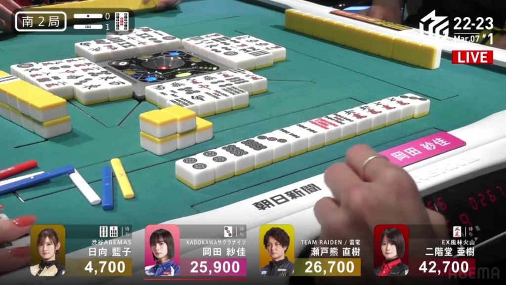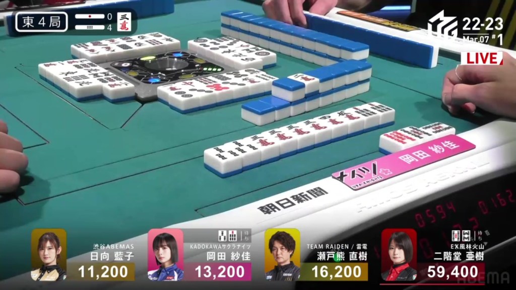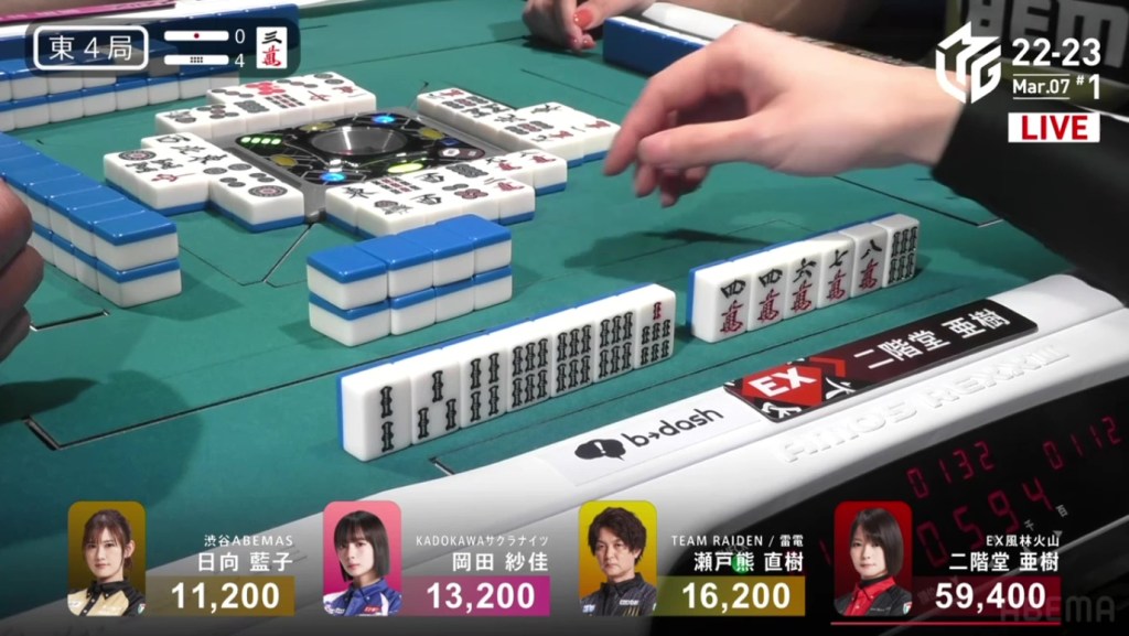 In E4-4, Okada is in 3rd place, 3,00 behind 2nd place Setokuma and a huge 46,200 behind 1st place Aki. Though finishing the game in 2nd place would be nice, the Sakura Knights really want to put space between them and the bottom two teams in the standings.