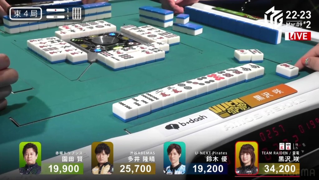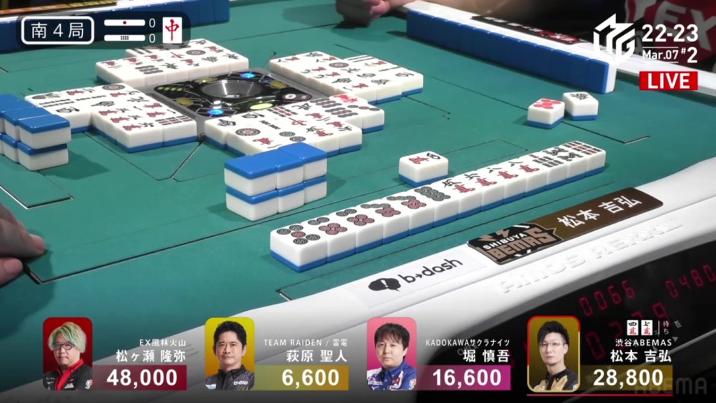 In S4-0, Matsumoto is the dealer and starts off with a huge starting hand, being iishanten with the first draw and guaranteed pinfu. On his very next draw, he gets to tenpai and calls riichi on a 47m ryanmen. With such a wide wait, Matsumoto was bound to win the hand. His opponents did pretty well trying to avoid, throwing terminals and honours in the first row. As his opponents started to successfully defend, Matsumoto’s chances of winning started to go down. By the end of the second row, Matsumoto only had three tiles left. As the second row became the third, only one was left in the wall. However, even as players started to defend, they started to get close to tenpai. In the middle of the third row, Hori gets to tenpai, but he would have to throw the 4m to take it. Being in 3rd place, he takes the risk and deals into Matsumoto. Flipping two uradora, Matsumoto wins the hand with Riichi/Pinfu/Ura 2 for 12,000, putting him within 7,200 of 1st.