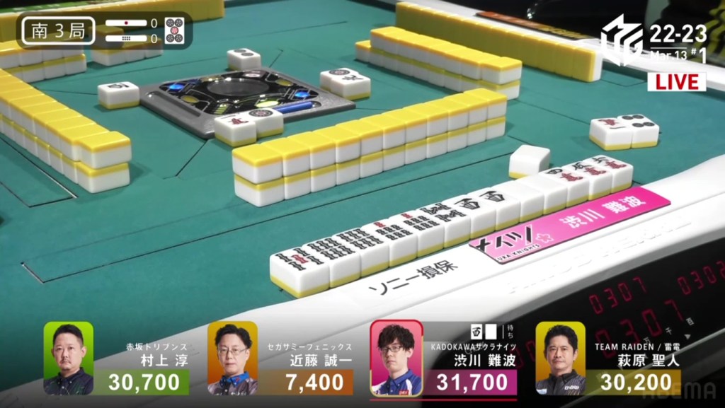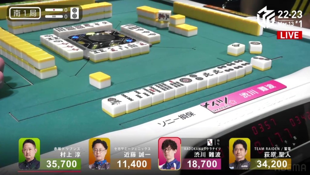 With Shibukawa’s first 14 tiles, he is already iishanten, holding a pair of white dragons for potential value. On his very next draw, he gets to tenpai and calls a turn 2 riichi on a west/white dragon shanpon.