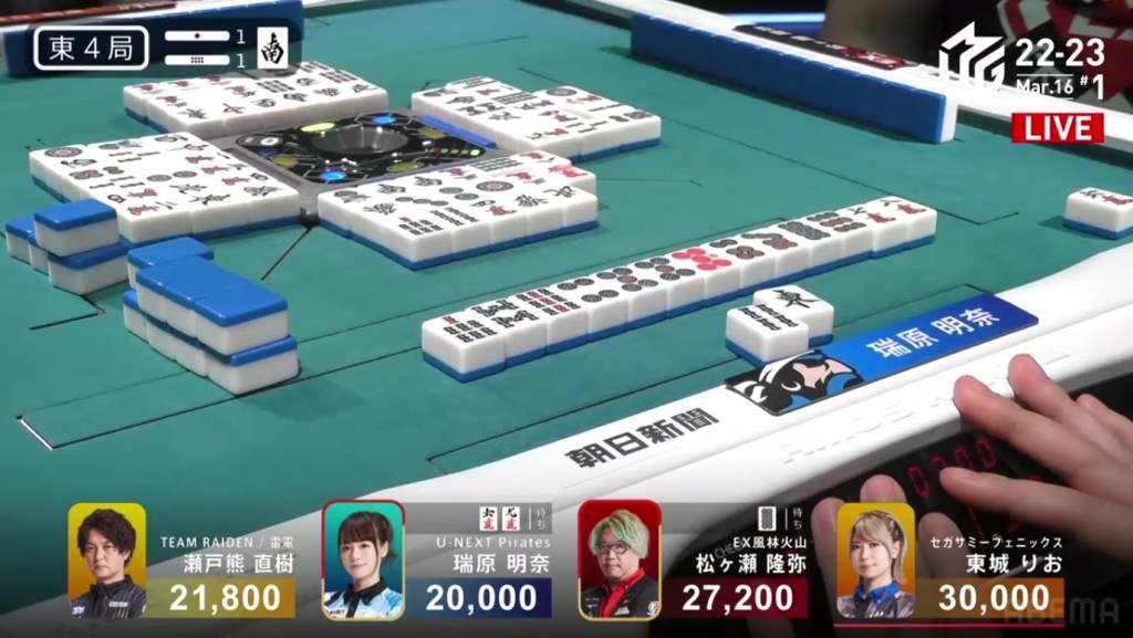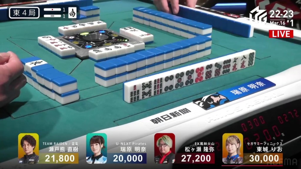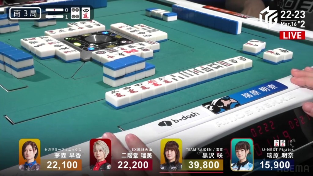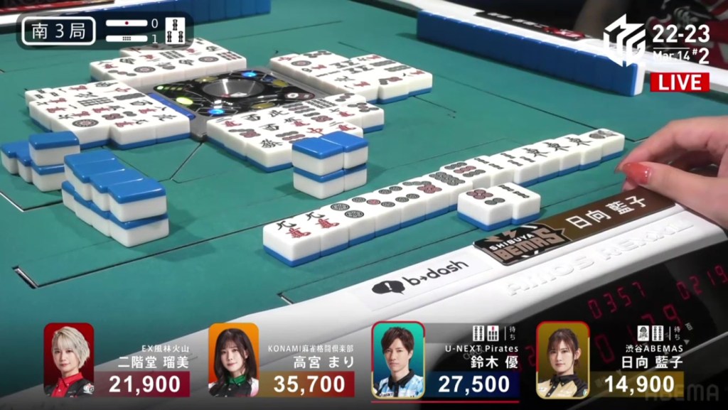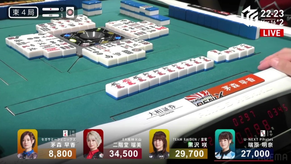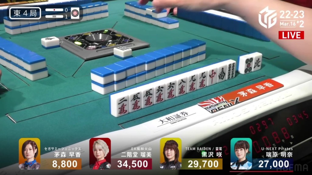 On Date’s draw right after, she gets to tenpai and calls riichi on a 14m ryanmen. Even though it’s riichi only, a win would be enough to move into 3rd. Though Uchikawa breaks the ippatsu with a kan, Date manages to get the 4m on her next draw to win the hand. Date wins with Riichi/Tsumo/Ura 1 for 1,000/2,000 to finish the game in 3rd.
