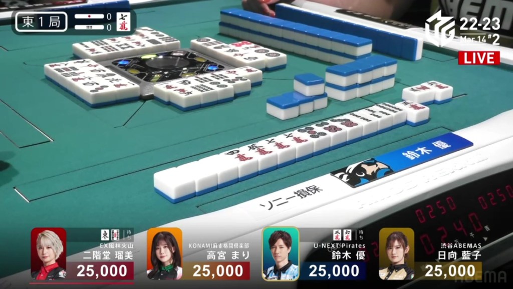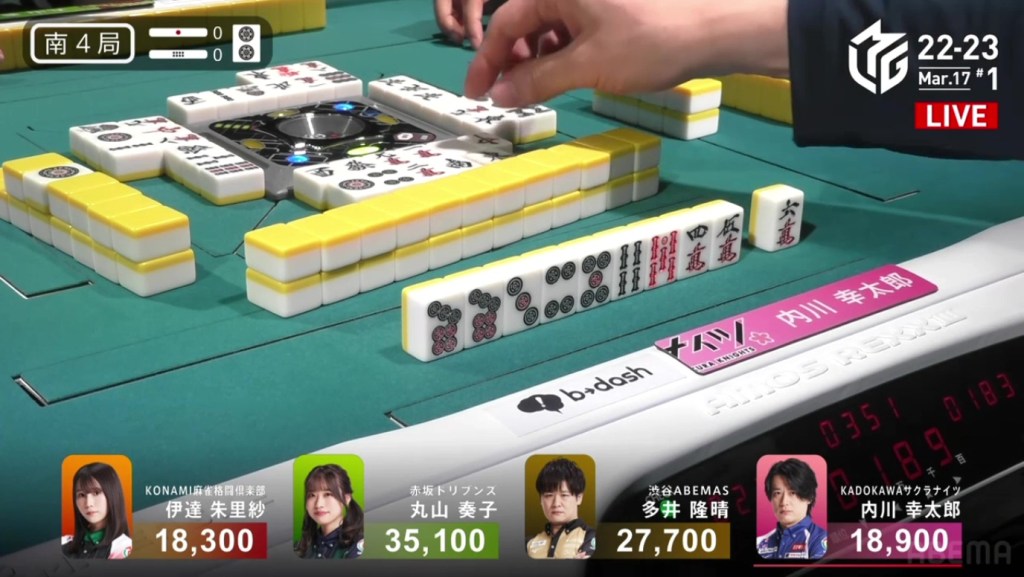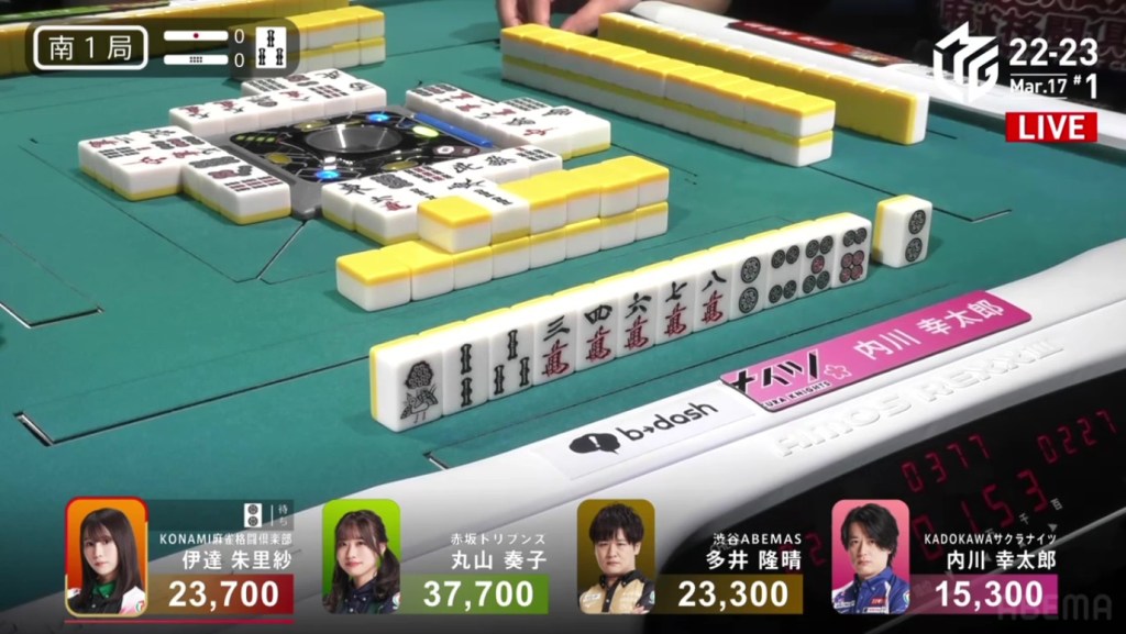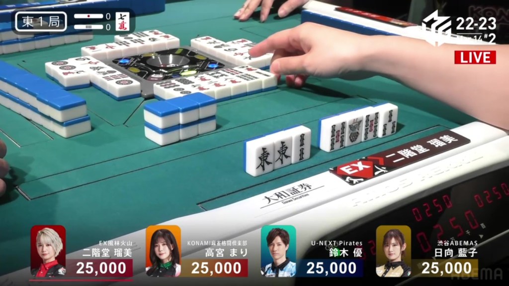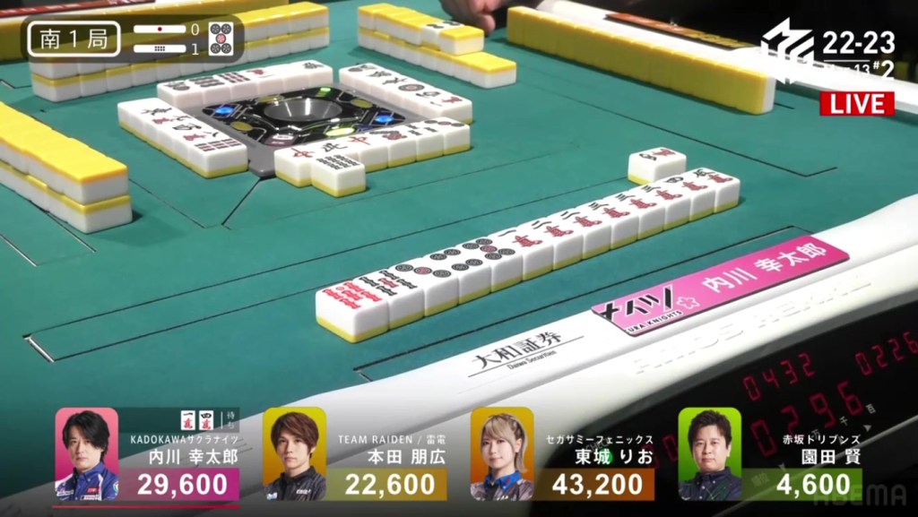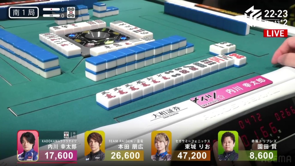 On Date’s draw right after, she gets to tenpai and calls riichi on a 14m ryanmen. Even though it’s riichi only, a win would be enough to move into 3rd. Though Uchikawa breaks the ippatsu with a kan, Date manages to get the 4m on her next draw to win the hand. Date wins with Riichi/Tsumo/Ura 1 for 1,000/2,000 to finish the game in 3rd.