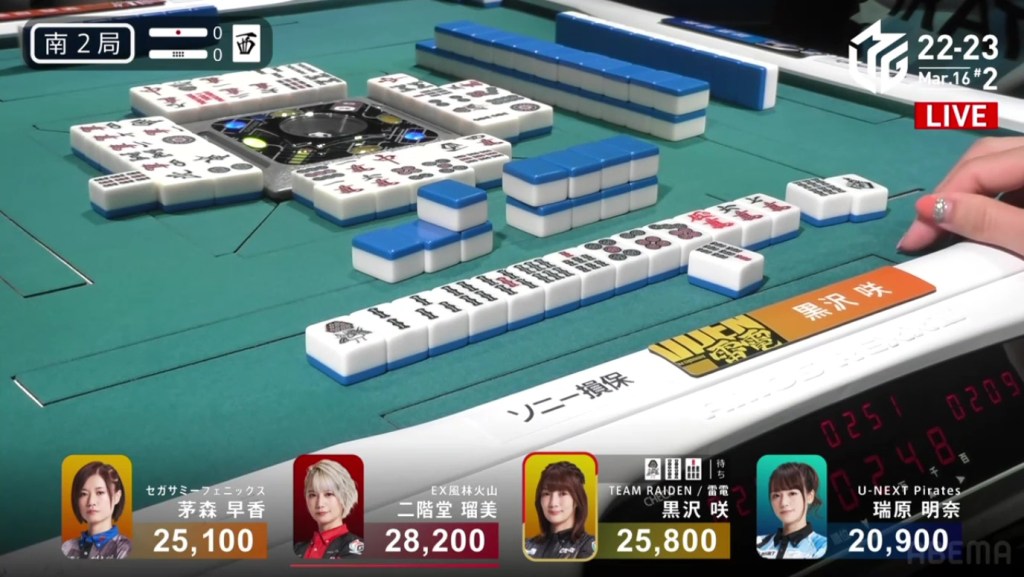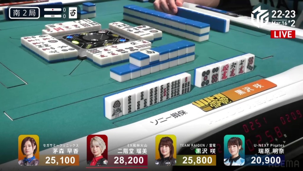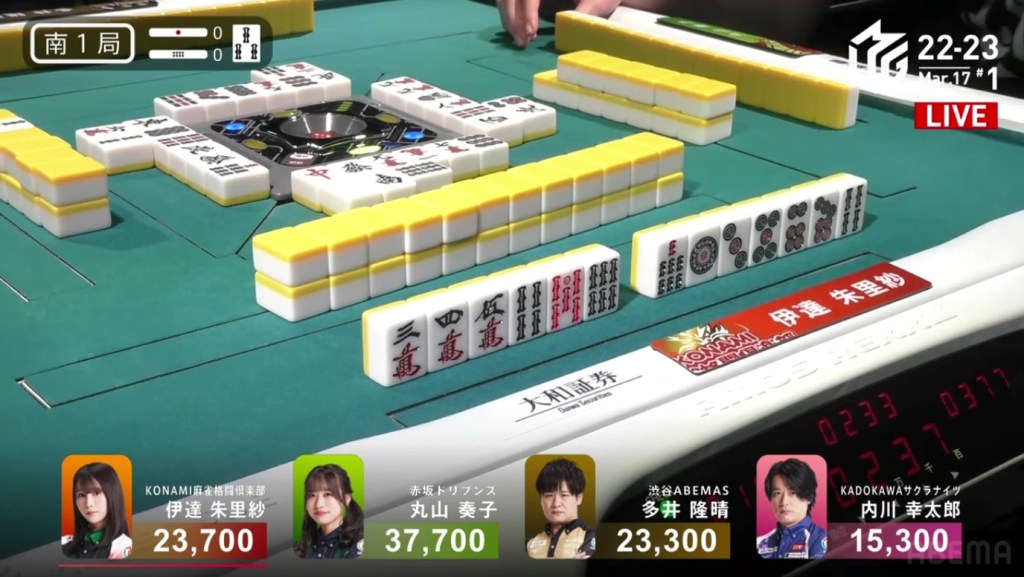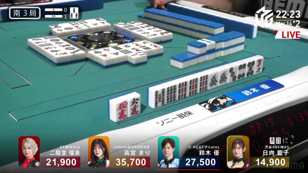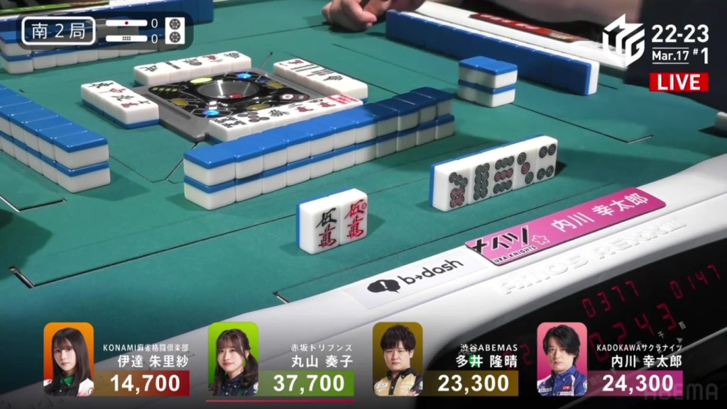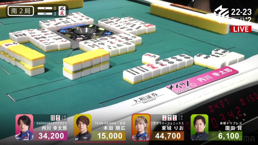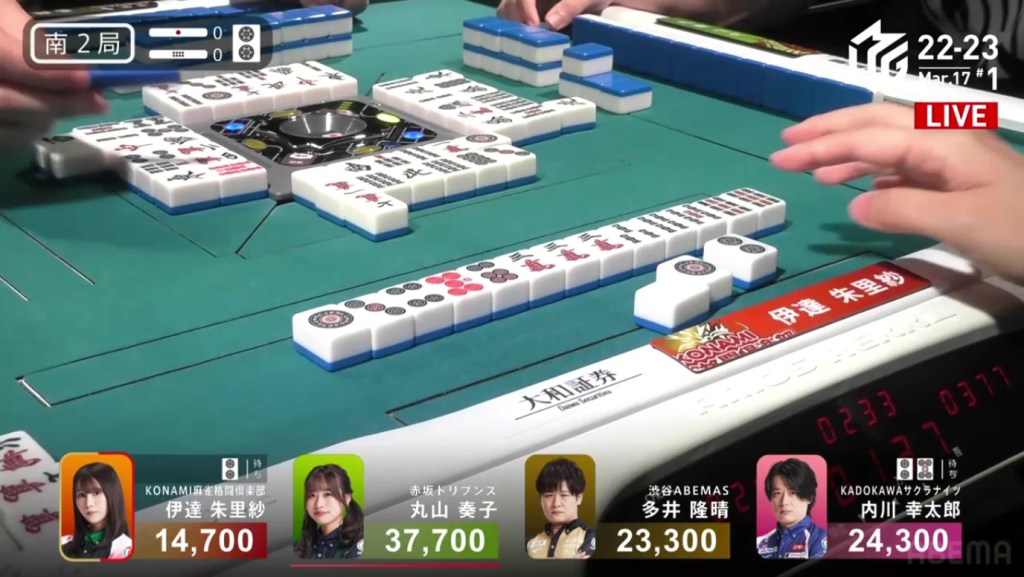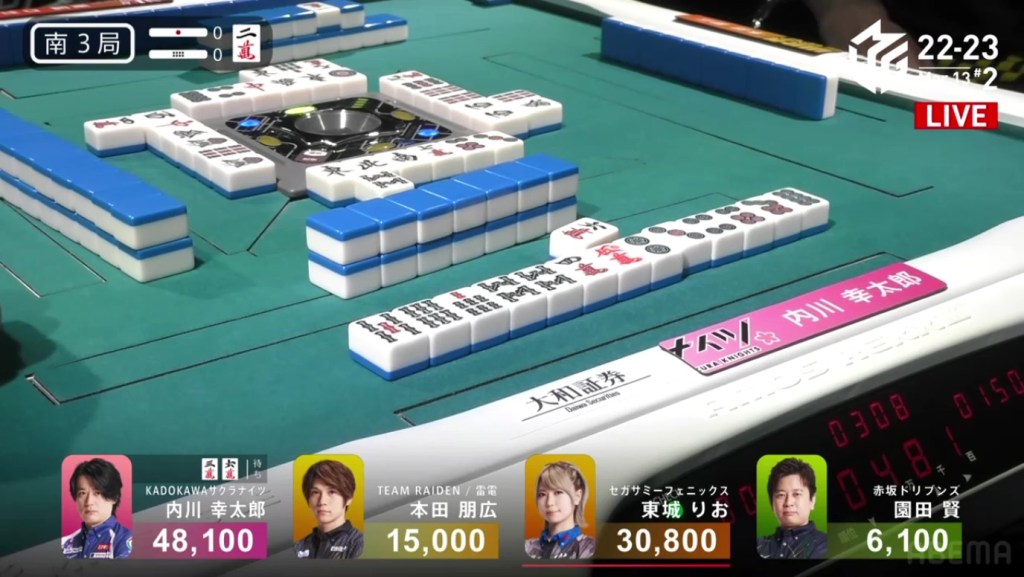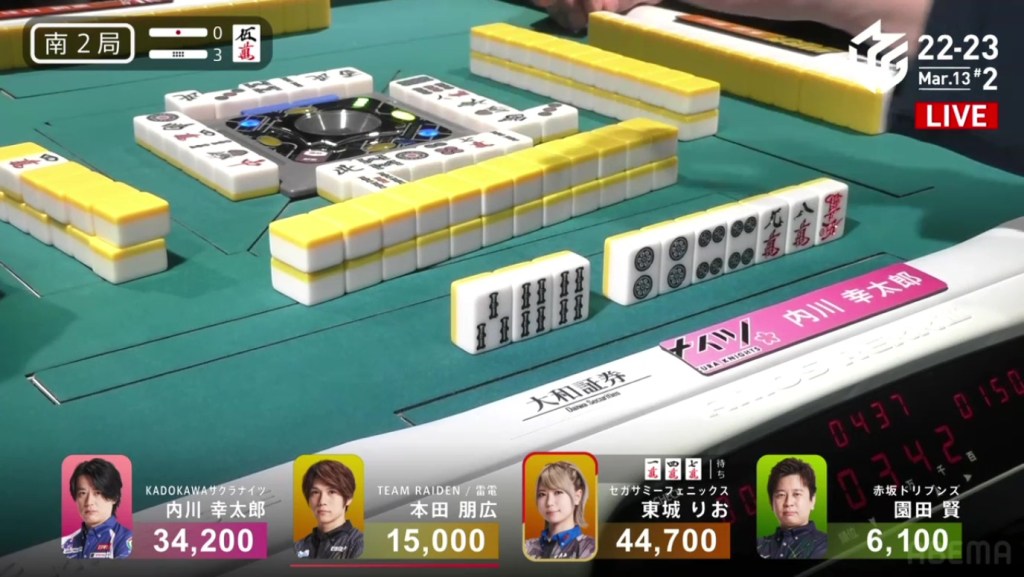 Right after, Date gets to tenpai and calls riichi waiting on a dora 2p kanchan. With their waits overlapping, Date’s only hope of winning is to draw the 2p herself. The first row becomes the second row and all of Uchikawa’s 5p are gone. With only the 2p left, there is no danger of Date dealing in. In the third row, Date is lucky enough to draw the 2p and win the hand. Date wins with Riichi/Tsumo/Dora 1/Aka 1 for 2,000/4,000 to move into 2nd place and push Uchikawa down.
