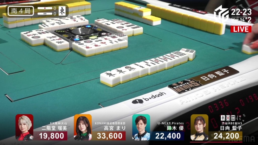In E4-1, Kayamori is back down to 4th place after a series of unfortunate draws. She is now 18,200 behind 3rd place dealer Mizuhara and needs at least a haneman tsumo to move up.
