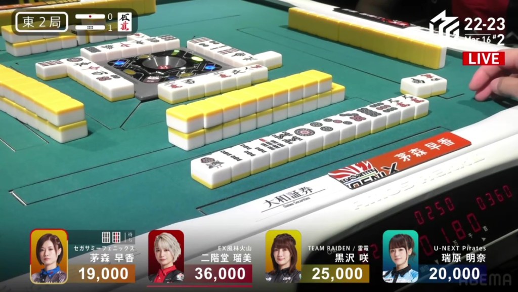 Mizuhara starts out the hand 3-shanten for chiitoi (4-shanten for a standard hand) with a red 5p. Though she has pairs of east and west, neither of them are yakuhai to her. Early on in the 3rd row, desperate Kayamori makes a kan on the 2s to try to get more value in her hand. With the kandora, the 4m becomes the dora, a tile that Mizuhara has a pair of. Through the rest for the first row, Mizuhara creates sequences and gets to 2-shanten by the end of the row. Drawing a 3m and a red 5m in the second row, Mizuhara gets to tenpai throws the red 5p and calls riichi on a 25m ryanmen, guaranteed at least a mangan. Two turns later, Kayamori throws the 5m as she calls riichi and ends up dealing into Mizuhara. With a flip of the uradora, Mizuhara’s west pair becomes dora to upgrade her hand to haneman. Mizuhara wins the hand with Riichi/Pinfu/Dora 2/Aka 1/Ura 2 for 12,000+300 to move into 2nd place.