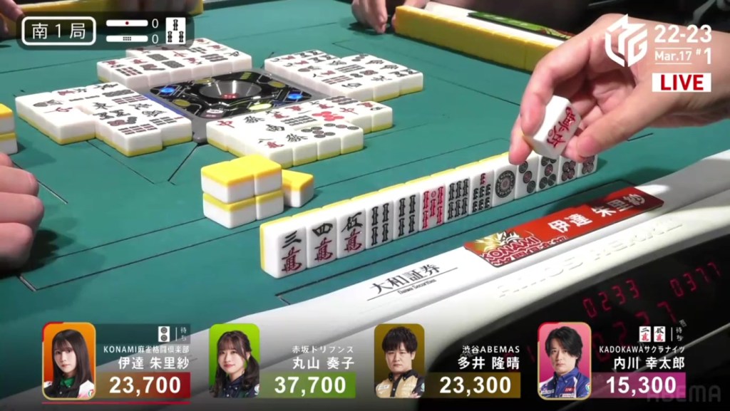 In S3-0, Uchikawa is in 1st place and wanting to win two quick hands to end the game. He starts out the hand 4-shanten with three ryanmens and a chance at tanyao and/or pinfu. In the first row, he completes many of those ryanmens and gets to a tanyao iishanten by turn 5. At the end of the first row, Uchikawa gets to tenpai and waits dama on a 36m ryanmen. Uchikawa is able to sneakily ron off of Sonoda’s discarded 6m a few turns later and win the hand. Uchikawa wins with Pinfu/Tanyao/Aka 1 for 3,900.