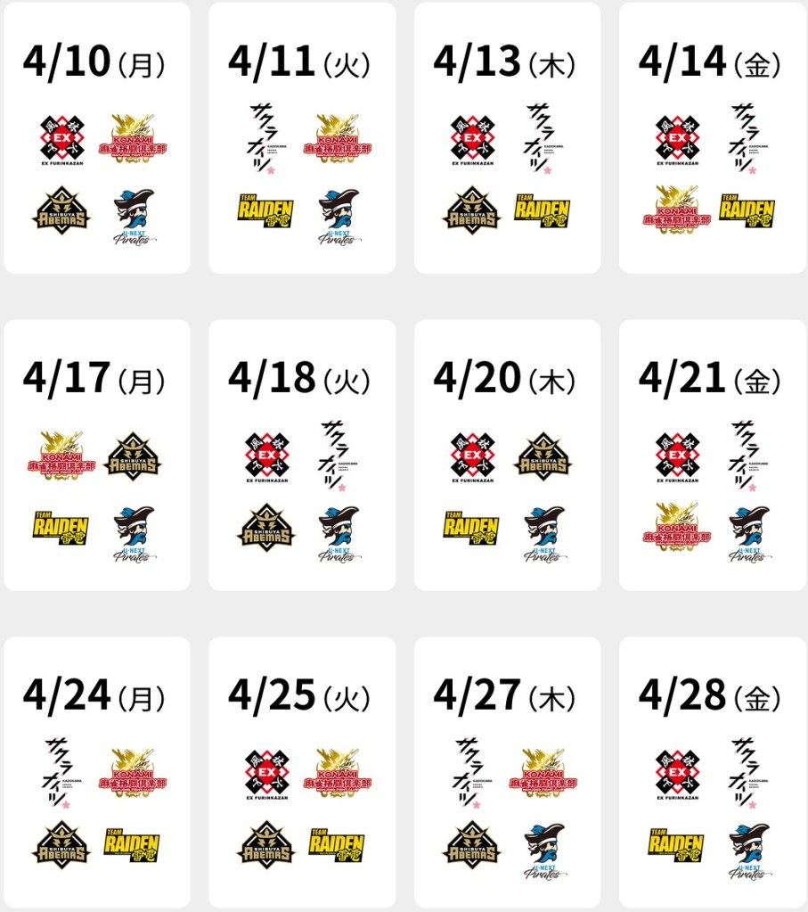 Games will take place every Monday, Tuesday, Thursday and Friday from April 10 to May 4. All games will start at 19:00 JST.