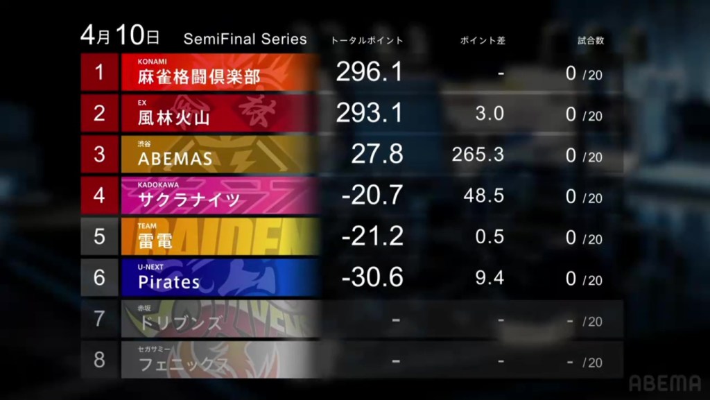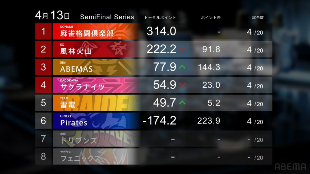 Konami Mahjong Fight Club are the last gaining team during the past six games. With great draws and great waits, the team got good results to extend their lead even further. Their biggest highlight came from Hisato when he won a dealer haneman in the very first hand of the semifinals and another haneman later on to finish with a big 1st place. If the team continues this trend, they will be hard to beat in the finals.