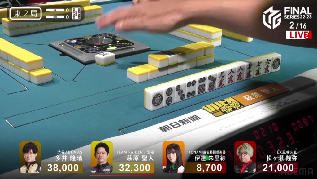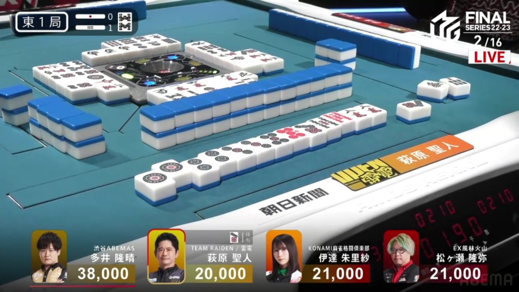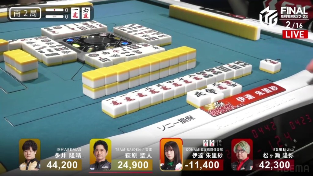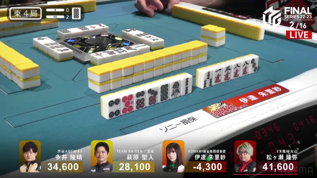 In S3-2, Hagiwara is in 3rd place and lagging behind Matsugase and Ooi. To get even close to the two of them, he needs either a haneman or a baiman tsumo.