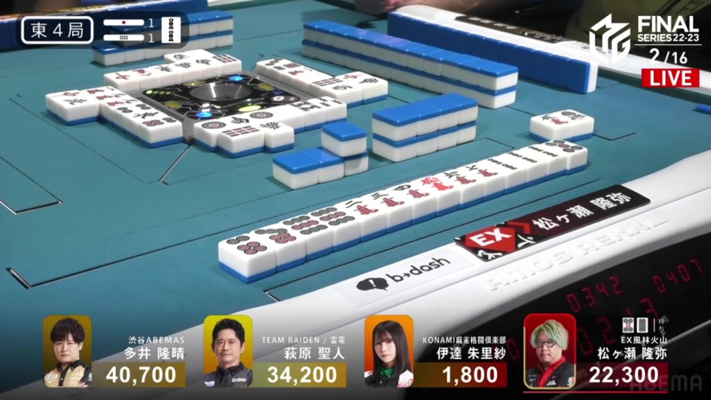 In E4-2, Ooi is in 2nd place after Matsugase passed him with a dealer haneman. Sitting 7,000 behind, a mangan tsumo would be enough to return to the top.