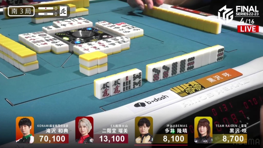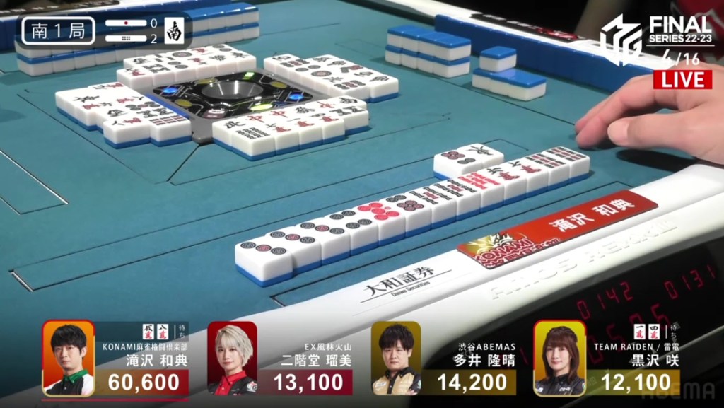 During the ippatsu round, Takizawa manages to get to tenpai. Despite the risk, Takizawa throws the red 5m and calls riichi on a 14m ryanmen. During the wait to see who would win, Ooi gets to a 14p ryanmen tenpai. However, after drawing the dangerous 4m and after a lot of thinking, Ooi folds. With the tiles dwindling down, it looked like the hand was going to go to a draw. Then, on the very last tile, Kurosawa draws and discards the 4m and deals into Takizawa. Takizawa wins the hand with Riichi/Tanyao/Houtei/Aka 1 for 8,000 plus a riichi stick to bring Takizawa’s score up to 79,100.