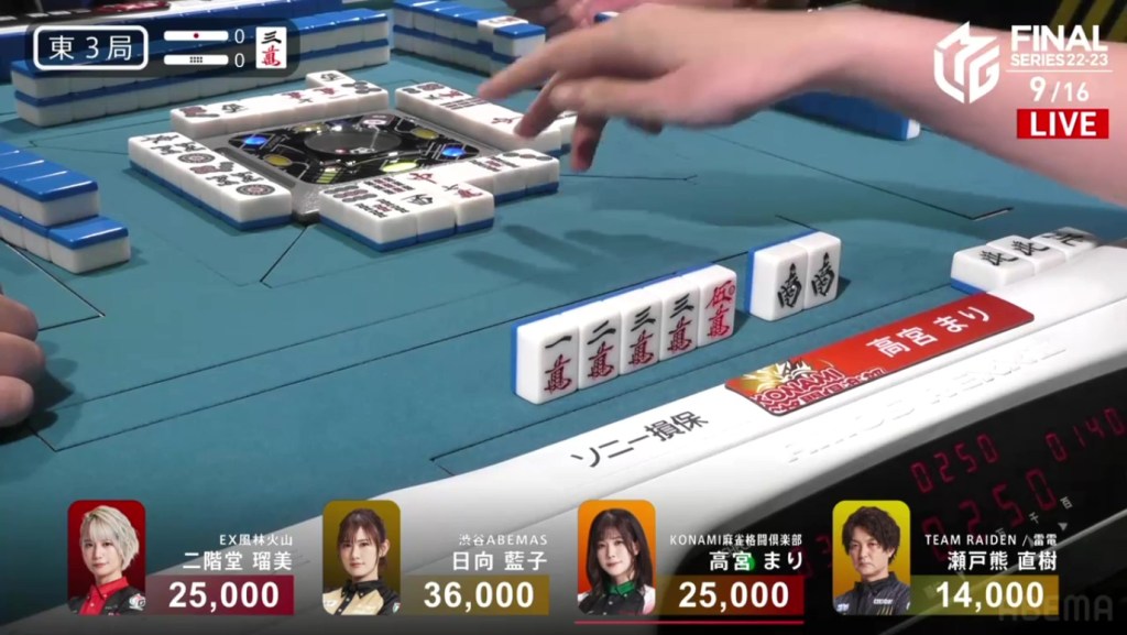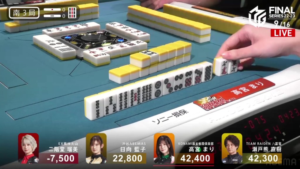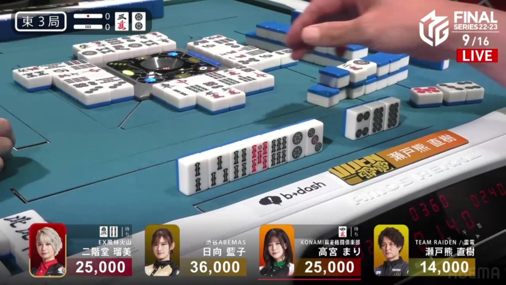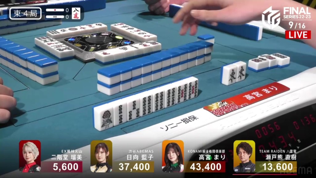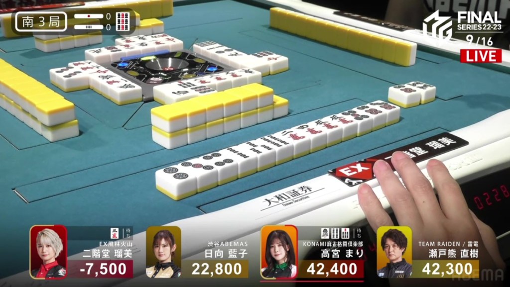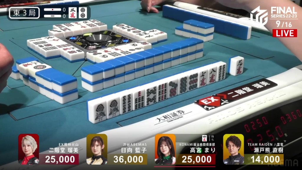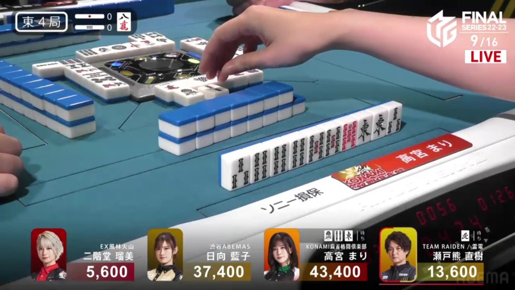 Even after dealing into a haneman in the very first hand, Setokuma managed to come back and take 1st place. This win is big, cutting the Abemas lead in half and getting the team within a 1st place of 1st place. Unfortunately for the EX Furinkazan, the 4th marks the team’s fourth 4th in as many games.