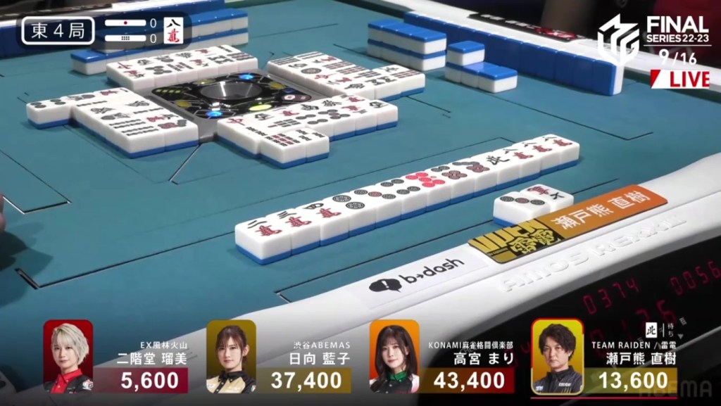 In E4-0, Setokuma is the dealer in 3rd place and trying to recover the points he lost in the first hand.