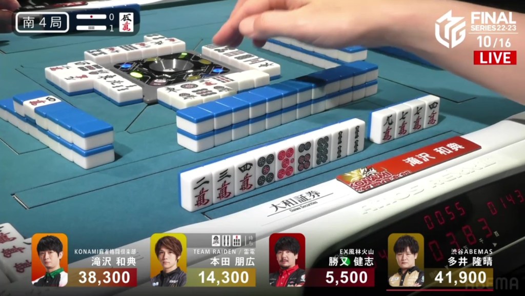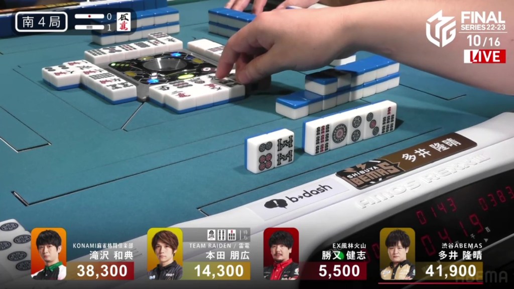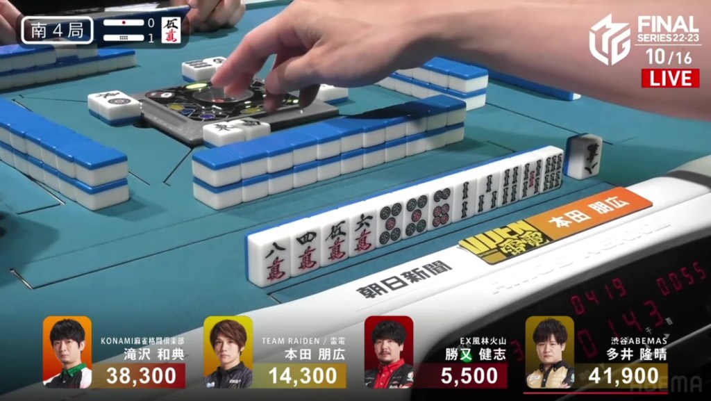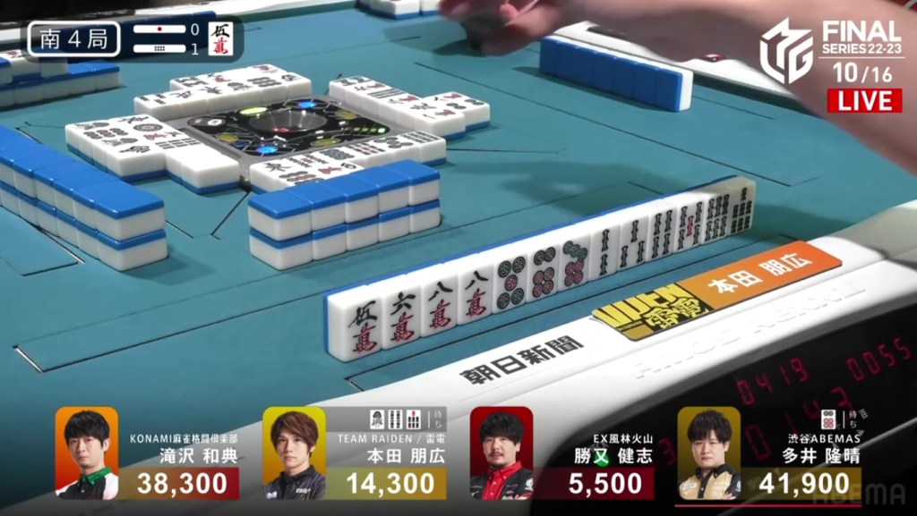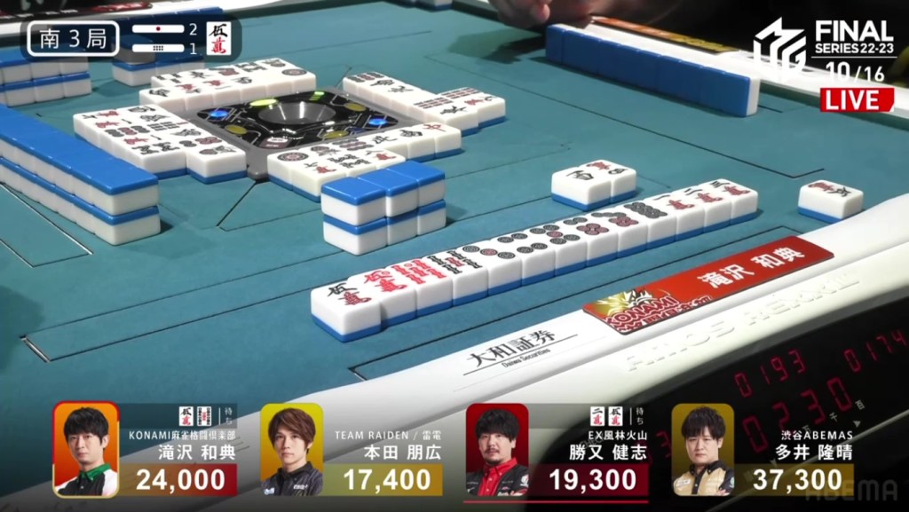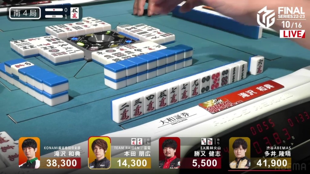 With that one decision, everything falls apart. The riichi stick now puts a 4,600 space between Takizawa and Ooi, meaning that tenpai payments and a baiman tsumo from Honda won’t be enough to drag Ooi down. The only things that will work now is a win by Takizawa or a direct hit off Ooi from anyone. Counting tiles, Takizawa has no more 8m and Ooi wasn’t dealing in, meaning Ooi has secured the win.