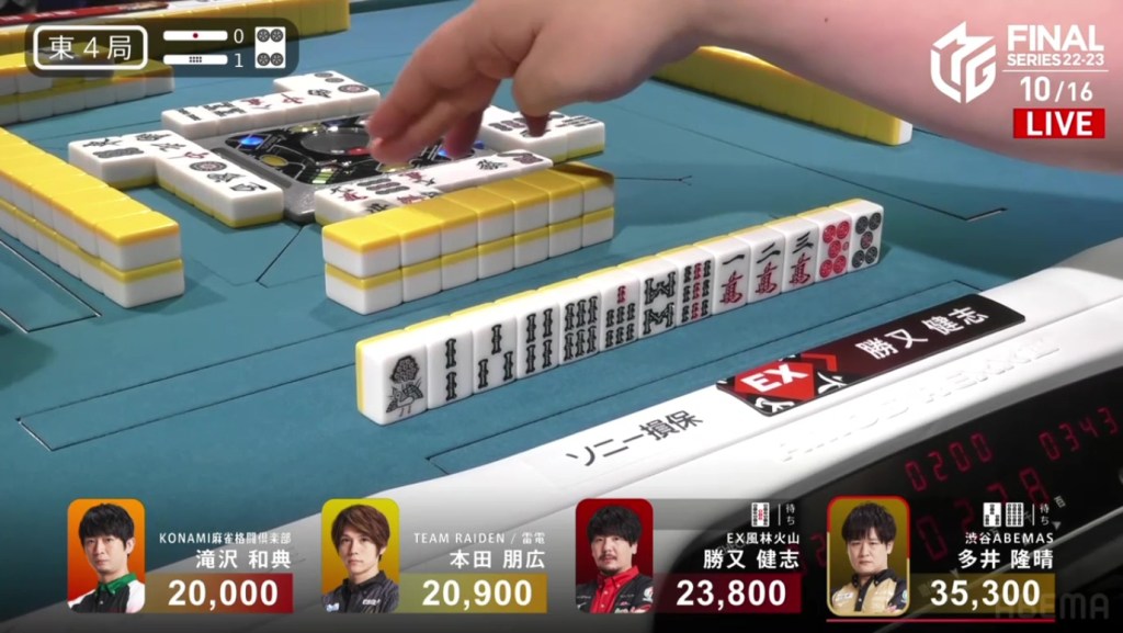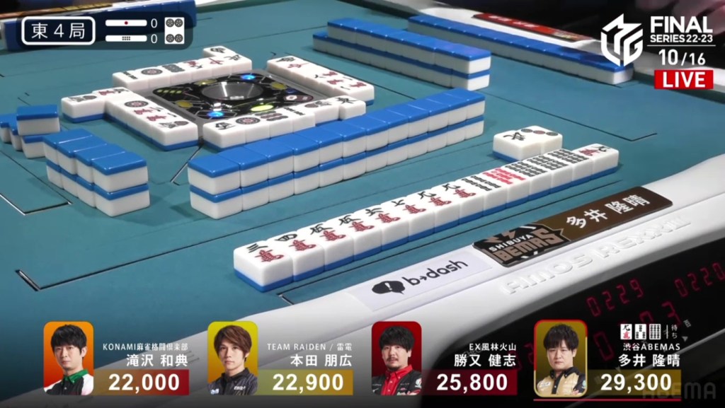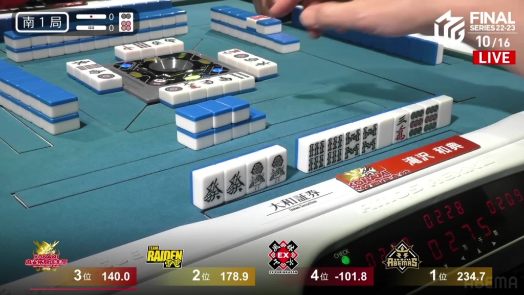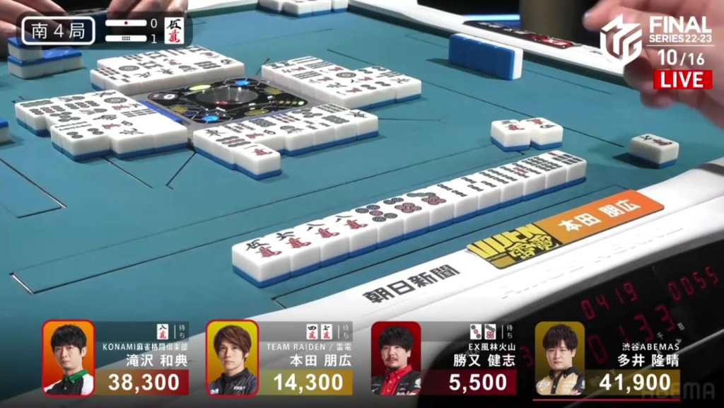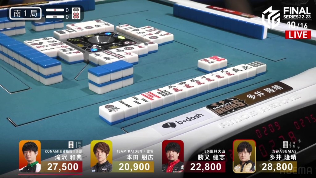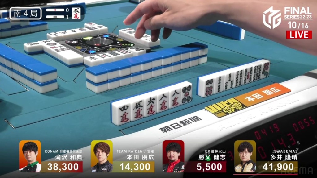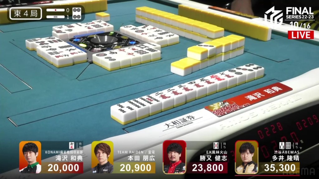With that one decision, everything falls apart. The riichi stick now puts a 4,600 space between Takizawa and Ooi, meaning that tenpai payments and a baiman tsumo from Honda won’t be enough to drag Ooi down. The only things that will work now is a win by Takizawa or a direct hit off Ooi from anyone. Counting tiles, Takizawa has no more 8m and Ooi wasn’t dealing in, meaning Ooi has secured the win.