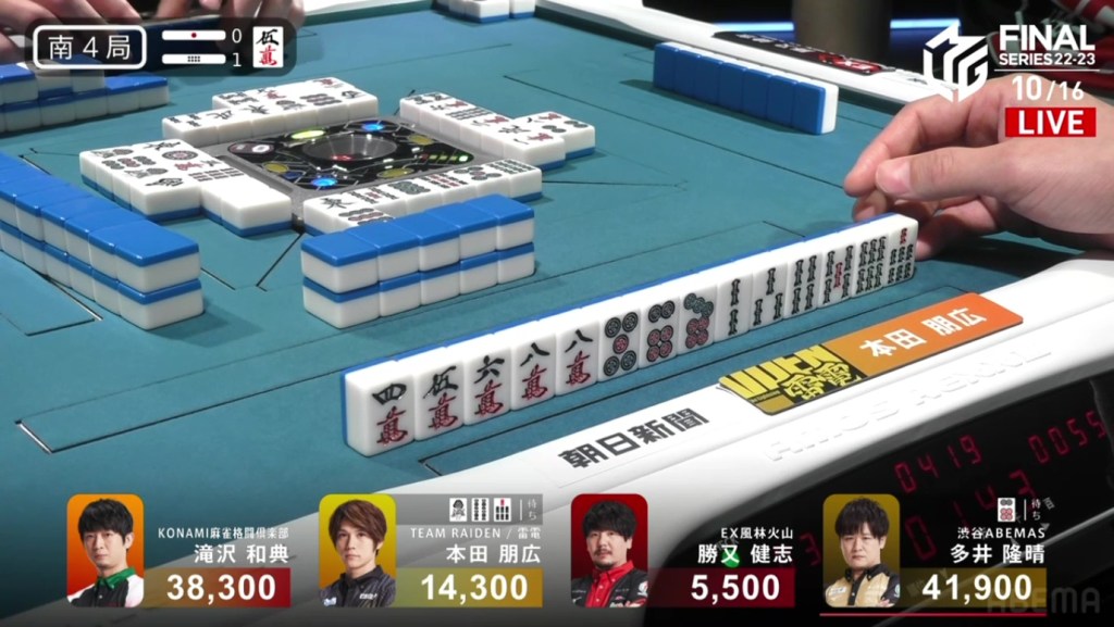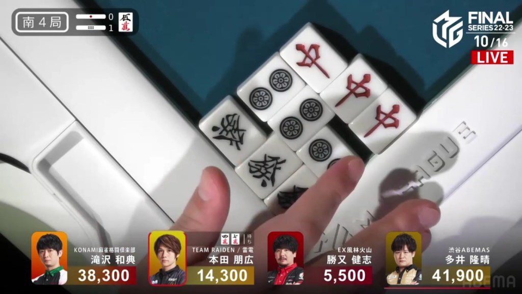 In S4-1, Honda is in 3rd place, 22,800 behind 2nd place Takizawa and 27,600 behind 1st place dealer Ooi. Though Honda’s only hope to move up in placement is to win a sanbaiman or better or to get an expensive direct hit, Honda has other objectives. With the Shibuya Abemas widening the gap over the competition, Honda wants to make sure that Ooi doesn’t win the game and widen the lead even further. With a 3/30 direct hit or a baiman tsumo, Ooi will move into 2nd place, and Takizawa will get the extra uma, making the pursuit of 1st easier for Team Raiden.