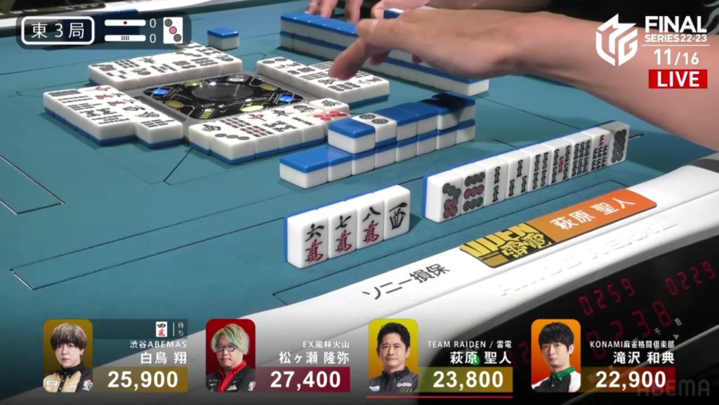 On his very next draw, Takizawa draws the 8p and win the hand. With this one single draw, Takizawa wins a Suuankou dealer yakuman for 16,000 all, a well-needed gain for the team.