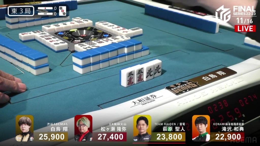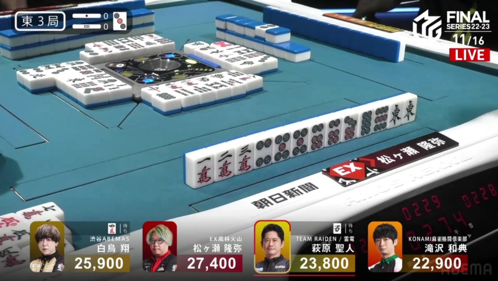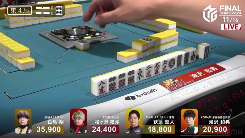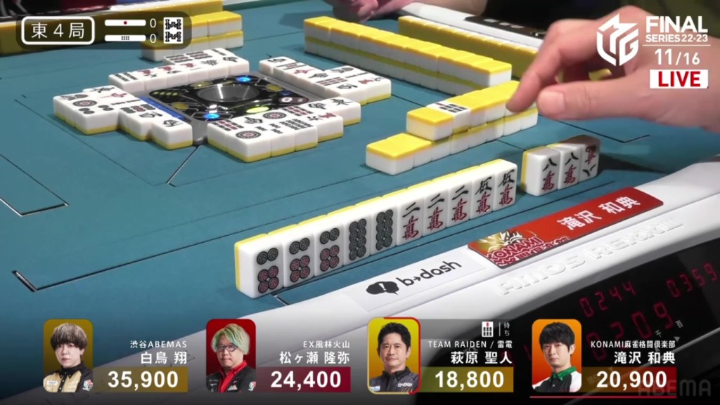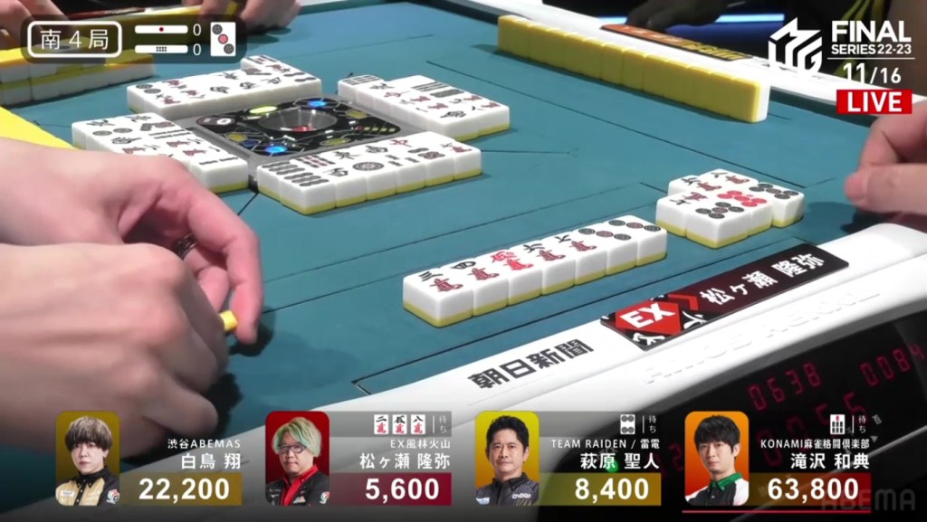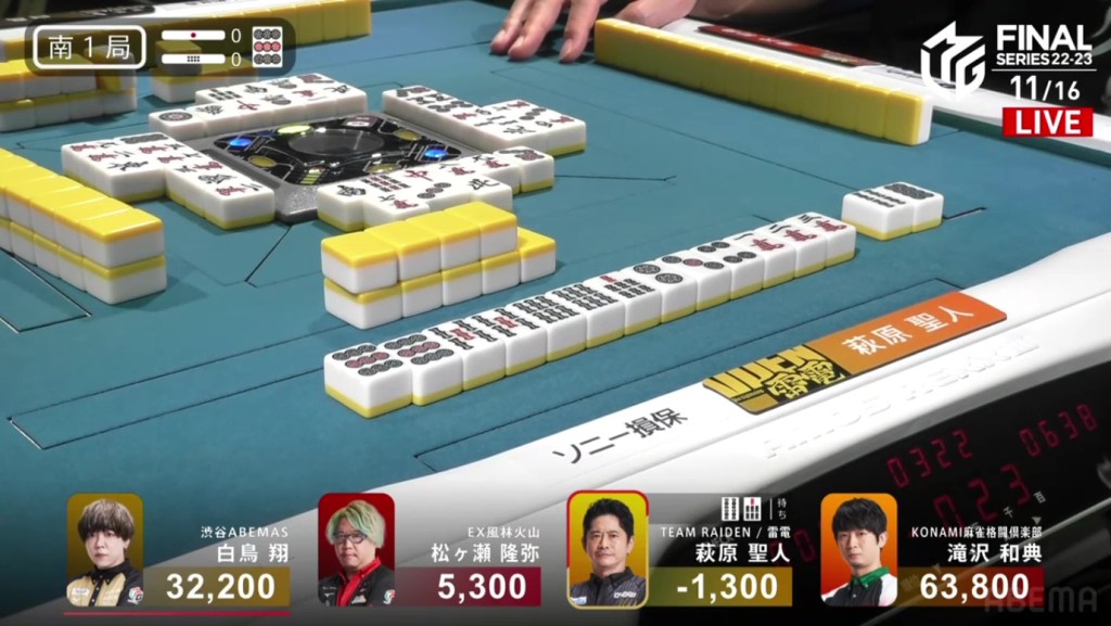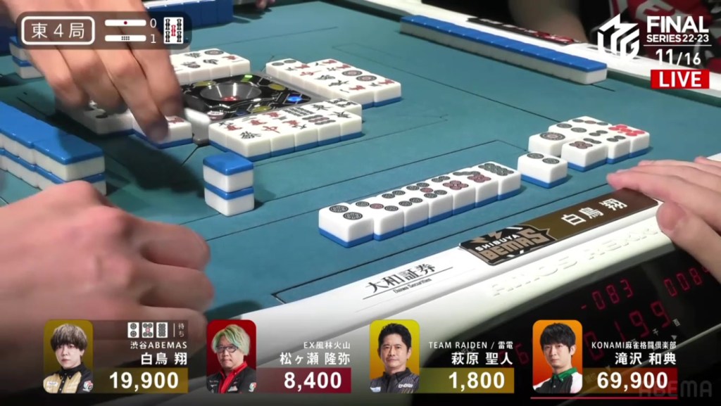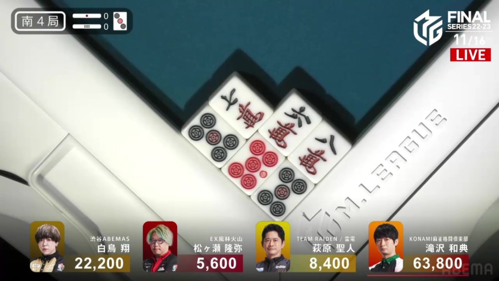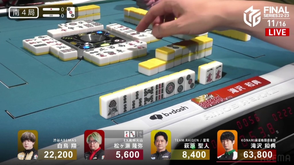 In E4-1, Shiratori is trying to recover some points after Takizawa won a dealer yakuman and stole Shiratori’s 1st.