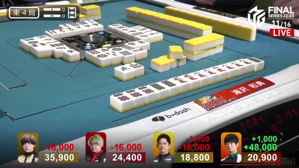 In E4-0, Takizawa is the dealer in 3rd place, 3,500 behind 2nd place Matsugase and 15,000 behind 1st place Takizawa. The Konami Mahjong Fight Club is in 3rd place and the team wants to get higher.