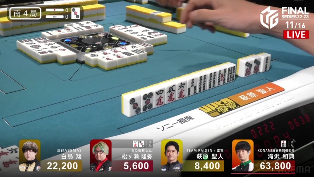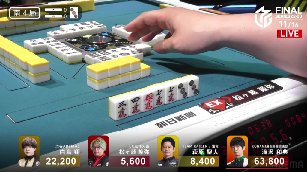In S4-0, Matsugase is in 4th place and 2,800 behind 3rd place Hagiwara. With a 2/40 tsumo, a 1/50 direct hit or a 3/30 general ron, Matsugase will finish the game in 3rd place.
